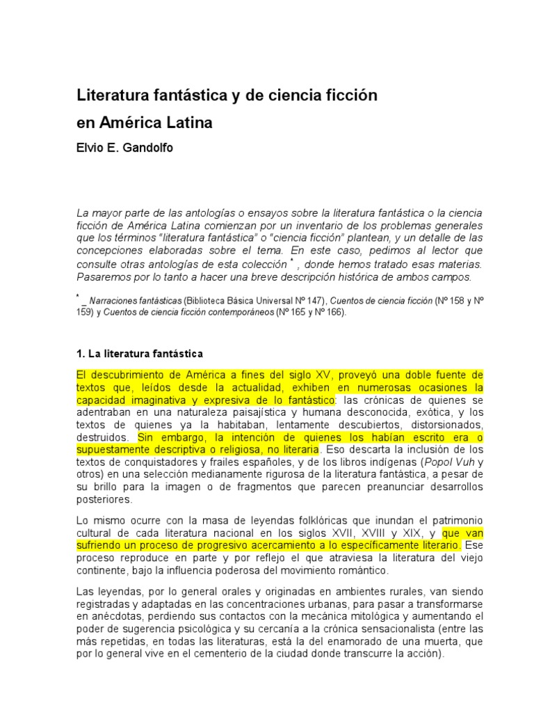 1. La literatura fantstica El descubrimiento de Amrica a fines del siglo XV, provey una doble fuente de textos que, ledos desde la actualidad, exhiben en numerosas ocasiones la capacidad imaginativa y expresiva de lo fantstico: las crnicas de quienes se adentraban en una naturaleza paisajstica y humana desconocida, extica, y los textos de quienes ya la habitaban, lentamente descubiertos, distorsionados, destruidos. Sin embargo, la intencin de quienes los haban escrito era o supuestamente descriptiva o religiosa, no literaria. Eso descarta la inclusin de los textos de conquistadores y frailes espaoles, y de los libros indgenas (Popol Vuh y otros) en una seleccin medianamente rigurosa de la literatura fantstica, a pesar de su brillo para la imagen o de fragmentos que parecen preanunciar desarrollos posteriores. Lo mismo ocurre con la masa de leyendas folklricas que inundan el patrimonio cultural de cada literatura nacional en los siglos XVII, XVIII y XIX, y que van sufriendo un proceso de progresivo acercamiento a lo especficamente literario. Ese proceso reproduce en parte y por reflejo el que atraviesa la literatura del viejo continente, bajo la influencia poderosa del movimiento romntico. Las leyendas, por lo general orales y originadas en ambientes rurales, van siendo registradas y adaptadas en las concentraciones urbanas, para pasar a transformarse en ancdotas, perdiendo sus contactos con la mecnica mitolgica y aumentando el poder de sugerencia psicolgica y su cercana a la crnica sensacionalista (entre las ms repetidas, en todas las literaturas, est la del enamorado de una muerta, que por lo general vive en el cementerio de la ciudad donde transcurre la accin).