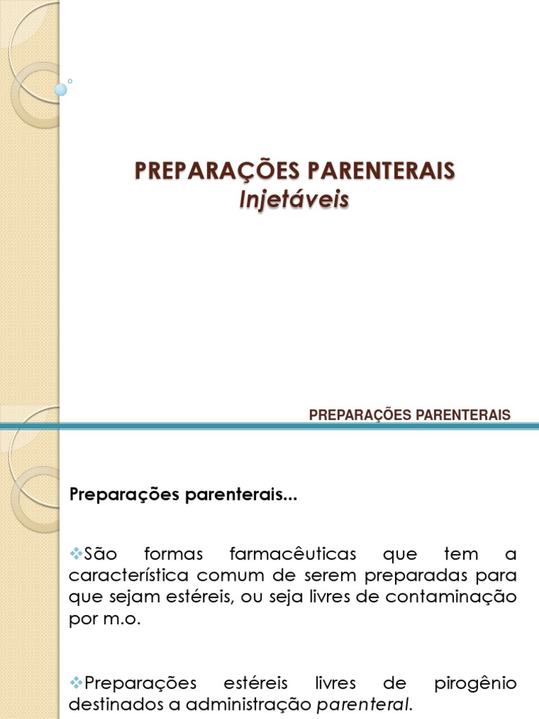 So formas farmacuticas que tem a caracterstica comum de serem preparadas para que sejam estreis, ou seja livres de contaminao por m.o.