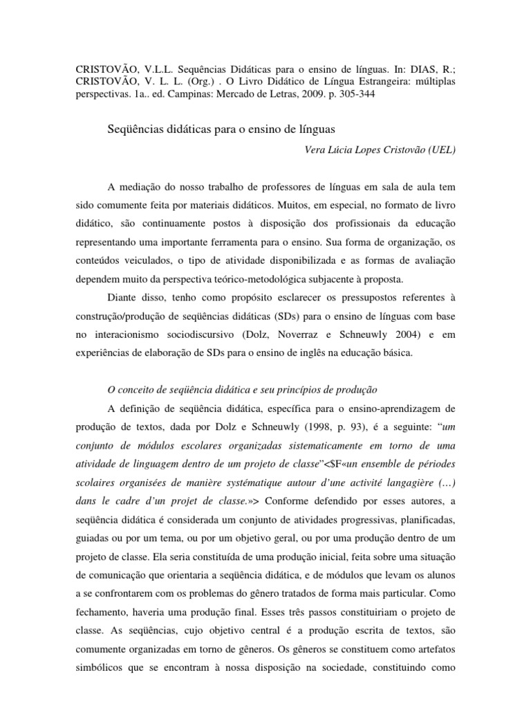 ________________________. Pour un enseignement de loral. Initiation aux genres formels lcole. Paris, ESF diteur, 1998. (Didactique du Franais.) ________________________. A la recherche de moyens denseignement pour lexpression crite et orale. In: PLANE, S. (Ed.). Manuels et enseignement du franais. [S. l.]: Cndp (Centre rgional de documentation pedagogique de Basse-Normandic), 1999, pp. 117-132. DOLZ, J.; NOVERRAZ, M.; SCHNEUWLY, B. Seqncias didticas para o oral e a escrita: apresentao de um procedimento. In: ROXO, R.; CORDEIRO, G. S. Campinas, Mercado de Letras, 2004, pp. 95-128. FIGUEIREDO, D. Critical discourse analysis: towards new perspective of EFL reading. In: LEFFA, V. J. (Comp). TELA: Textos em Lingstica Aplicada. Pelotas, Educat, 2000 - CD-ROM. GRIGOLETTO, M. A concepo de texto e de leitura do aluno de 1 e 2 graus e o desenvolvimento da conscincia crtica. In: CORACINI, M. J. R. F. (Org.) O jogo discursivo na aula de leitura: lngua materna e lngua estrangeira. Campinas, Pontes, 1995a, pp. 85-91. _______________. Processos de significao na aula de leitura em lngua estrangeira. In: ______. (Org.) O jogo discursivo na aula de leitura: lngua materna e lngua estrangeira. Campinas, Pontes, 1995b, pp. 103-111. ________________. Leitura e funcionamento discursivo do livro didtico. In: ______. (Org.) Interpretao, autoria e legitimao do livro didtico: lngua materna e lngua estrangeira. Campinas, Pontes, 1999a, pp. 67-77. ________________. Sees de leitura no livro didtico de lngua estrangeira: lugar de interpretao? In: ______. (Org.) Interpretao, autoria e legitimao do livro didtico: lngua materna e lngua estrangeira. Campinas, Pontes, 1999b, pp. 79-91. KLEIMAN, A. B.; MORAES, S. E. Leitura e interdisciplinaridade: tecendo redes nos projetos da escola. Campinas, Mercado de Letras, 1999. (Coleo Idias sobre linguagem.) LEFFA, V. J. Fatores da compreenso na leitura. In: ______ (Comp.) TELA: Textos em Lingstica Aplicada. Pelotas, Educat, 2000 - CD-ROM. MACHADO, A. R. Uma experincia de assessoria docente e a elaborao de material didtico para o ensino de produo de textos na universidade. D.E.L.T.A., vol. 16, n 1, pp. 1-26, 2000. _______________. Pelas trilhas dos Parmetros Curriculares Nacionais de Lngua Portuguesa: a construo conjunta de uma seqncia didtica centrada em um gnero. So Paulo, Pontifcia Universidade Catlica, no prelo a. _______________. Um instrumento de avaliao de material didtico com base nas capacidades de linguagem a serem desenvolvidas no aprendizado de produo textual. So Paulo, Pontifcia Universidade Catlica, no prelo b. NOGUEIRA, A. L. H. Eu leio, ele l, ns lemos: processos de negociao na construo da leitura. In: SMOLKA, A. L. B.; GES, M. C. R. (Orgs.) A linguagem e o outro no espao escolar: Vygotsky e a construo do conhecimento. Campinas, Papirus, 1993/1997. (Coleo Magistrio: formao e trabalho pedaggico.)