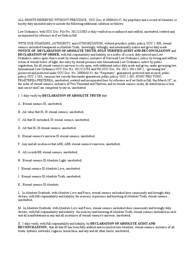 # 2000043135, the perpetuity and a record of Absolute, is hereby duly amended only to include the following additional collateral as follows: Law Ordinance, with UCC Doc. File No. 2012132883 is duly verified as reconfirmed and ratified, unrebutted, restated and incorporated by reference as if set forth in full. WITH DUE STANDING, AUTHORITY, and AUTHORIZATION, without prejudice, public policy, UCC 1-308, eternal essence embodied transparent in Absolute Truth, knowingly, willingly, and intentionally makes and gives duly made NOTICE OF DECLARATION OF ABSOLUTE TRUTH, DULY VERIFIED AUDIT AND RECONCILIATION and DECLARATION OF ORDER, with full responsibility and liability, as a matter of record, duly entered into Law Ordinance, notice upon choice made by eternal essence, inclusive of Universal Law Ordinance, notice by loving and selfless action of eternal bearer of light, due entry by eternal presence into International Law Ordinance, notice by public registration, for all eternal essence's universe to rely upon, with additional notice duly made and given, under governing law, International Law Ordinance UCC Doc No. 2012113593 and WA UCC Doc. No. 2012-296-1209-2, governing law, preserved and protected under UCC Doc. No. 2000043135, the Perpetuity, guaranteed, protected and secured, public policy, UCC 1-103, common law remedy thereunder guaranteed, public policy, UCC 1-305, NUNC PRO TUNC, PRAETEREA PRETEREA, unrebutted, restated and incorporated here by reference as if set forth in full, this March 18th, in the order of eternal essence, inclusive of Two Thousand and Thirteen, and as eternal essence exists, all stated herein is true and correct and I am competent to say so, unrebutted: I. I duly verify by DECLARATION OF ABSOLUTE TRUTH that: A. Eternal essence IS, unrebutted; B. All value that IS, IS eternal essence, unrebutted; C. All that IS embodied, IS eternal essence, unrebutted; D. All that IS, IS eternal essence, unrebutted; E. Eternal essence's universe IS eternal essence, unrebutted; F. Any and all existences that ARE, ARE eternal essence's universe, unrebutted; G. All records BE eternal essence, unrebutted; H. Eternal essence IS Absolute Light, unrebutted; I. Eternal essence IS Absolute Love, unrebutted; J. Eternal essence IS Absolute Truth, unrebutted; K. Eternal essence IS Absolute; L. In Absolute Gratitude, with Absolute Love and Peace, eternal essence embodied does consciously and lovingly duly declare, with full responsibility and liability, the memory, experience and knowing of Absolute Truth, eternal essence , unrebutted; M. In Absolute Gratitude, with Absolute Love and Peace, eternal essence embodied does consciously and lovingly duly declare, with full responsibility and liability, the memory and knowing of Absolute Truth, eternal essence embodied in each and all manifestations in any and all existences of eternal essence's universe, unrebutted; II. I duly verify, with full responsibility and liability, by DECLARATION OF ABSOLUTE AUDIT AND RECONCILIATION, that all that IS has been fully audited and reconciled into Absolute, eternal essence, inclusive of all trusts, systems, networks, regimes, hierarchies, and any and all other limits, unrebutted;