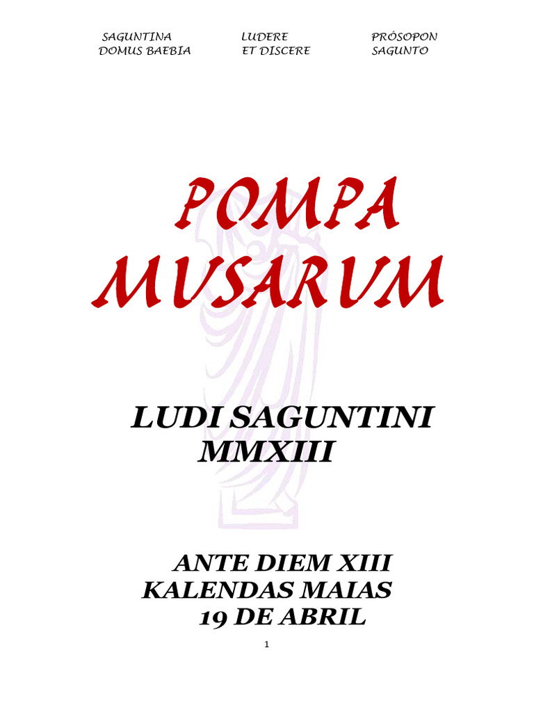 Por quinto ao consecutivo, el teatro saguntino retrocede de nuevo en el tiempo durante unas horas. Antes de disfrutar de la obra Hipspila, se inaugurar la jornada con la recreacin de una Pompa Musarum. Partiendo de la descripcin que hace Dionisio de Halicarnaso, VII, 72 de una Pompa circensis en la que los dioses son los protagonistas de la procesin, hemos recreado nuestra Pompa Musarum en homenaje al legado griego, con la llegada de una delegacin helena cuyo objetivo es despertar el respeto, la admiracin y el amor por todo aquello que el mundo griego ha dejado en nuestra cultura. En la recreacin de la Pompa de los Ludi Saguntini MMXIII hay varios hechos que nos han animado a dedicar esta procesin a nuestros antepasados helenos. En concreto nos referimos a la conferencia de Pedro Olalla en el marco de la ltima Jornada de Cultura Clsica de Sagunto, el evento Yo conozco mi herencia y t? organizado por la asociacin murciana Amuprolag y el vdeo grabado por el IES Ingeniero de la Cierva, Gracias Grecia, bajo la direccin de Arstides Mnguez. Con esta Pompa queremos poner nuestro granito de arena y no olvidar que todos somos griegos.