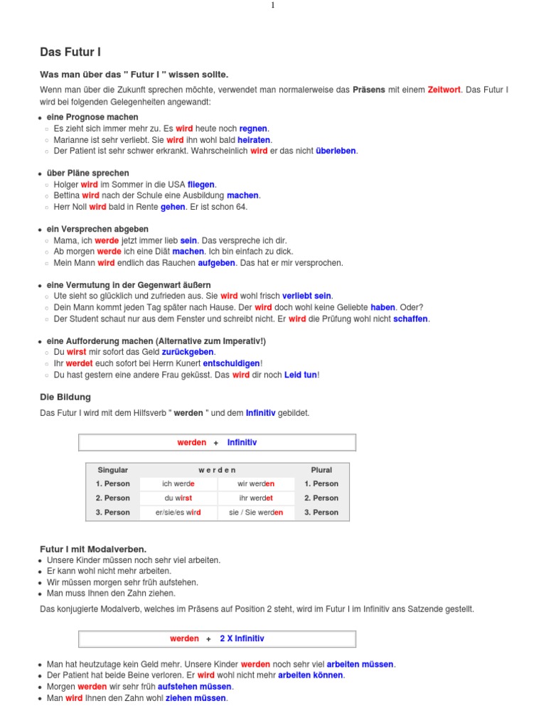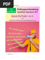 Wenn man ber die Zukunft sprechen mchte, verwendet man normalerweise das Prsens mit einem Zeitwort. Das Futur I wird bei folgenden Gelegenheiten angewandt: eine Prognose machen Es zieht sich immer mehr zu. Es wird heute noch regnen. Marianne ist sehr verliebt. Sie wird ihn wohl bald heiraten. Der Patient ist sehr schwer erkrankt. Wahrscheinlich wird er das nicht berleben. ber Plne sprechen Holger wird im Sommer in die USA fliegen. Bettina wird nach der Schule eine Ausbildung machen. Herr Noll wird bald in Rente gehen. Er ist schon 64. ein Versprechen abgeben Mama, ich werde jetzt immer lieb sein. Das verspreche ich dir. Ab morgen werde ich eine Dit machen. Ich bin einfach zu dick. Mein Mann wird endlich das Rauchen aufgeben. Das hat er mir versprochen. eine Vermutung in der Gegenwart uern Ute sieht so glcklich und zufrieden aus. Sie wird wohl frisch verliebt sein. Dein Mann kommt jeden Tag spter nach Hause. Der wird doch wohl keine Geliebte haben. Oder? Der Student schaut nur aus dem Fenster und schreibt nicht. Er wird die Prfung wohl nicht schaffen. eine Aufforderung machen (Alternative zum Imperativ!) Du wirst mir sofort das Geld zurckgeben. Ihr werdet euch sofort bei Herrn Kunert entschuldigen! Du hast gestern eine andere Frau geksst. Das wird dir noch Leid tun!
