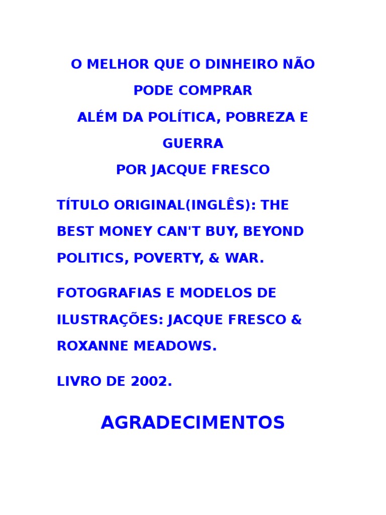 BEST MONEY CAN'T BUY, BEYOND POLITICS, POVERTY, & WAR. FOTOGRAFIAS E MODELOS DE ILUSTRAES: JACQUE FRESCO & ROXANNE MEADOWS. LIVRO DE 2002.