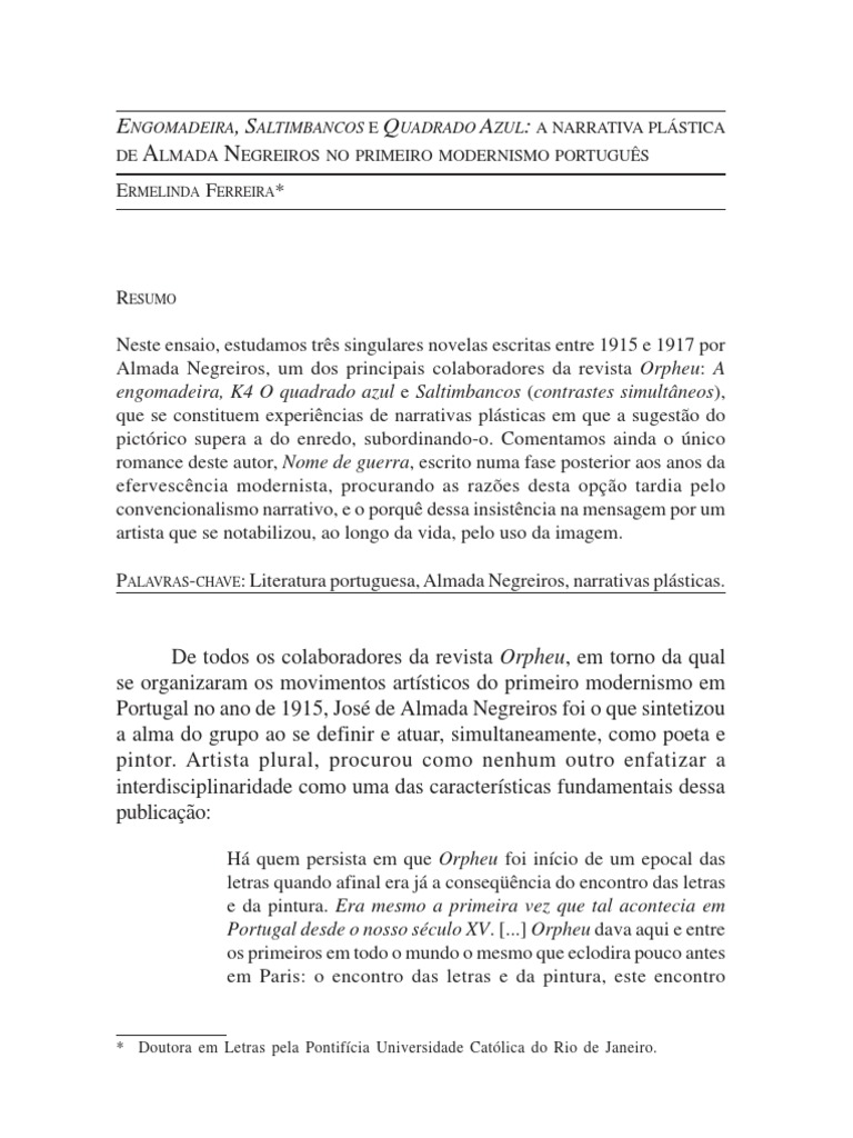 fundo transcenderia os limites deste trabalho. Limitamo-nos, portanto, a comentar alguns dos textos de Almada Negreiros mais representativos deste diálogo entre os meios: as três peças ficcionais produzidas nos anos da efervescência modernista – A engomadeira, “novela vulgar lisboeta” escrita em 1915 e publicada em folheto em 1917; K4 O quadrado azul, “poesia términus” publicada em folheto em 1917; e Saltimbancos (contrastes simultâneos), de 1916, publicado em 1917 na revista Portugal Futurista, dedicados respectivamente a José Pacheco, Amadeo de Souza-Cardoso e Santa