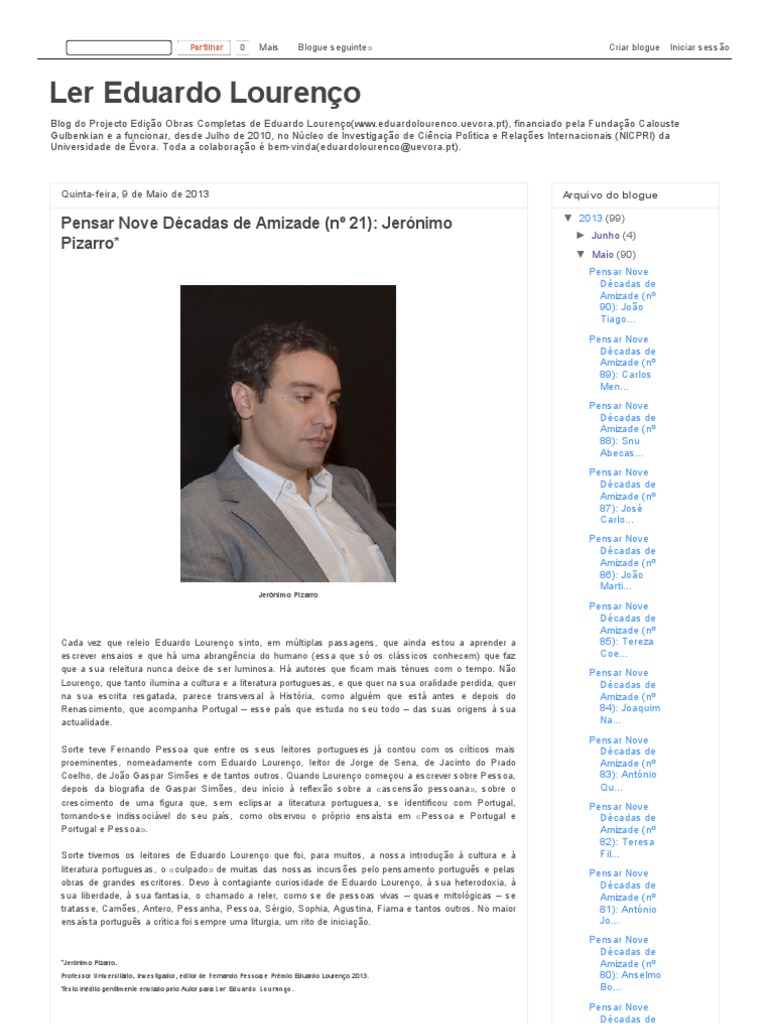 Arquivo do blogue 2013 (99) Junho (4) Maio (90) Pensar Nove Dcadas de Amizade (n 90): Joo Tiago... Pensar Nove Dcadas de Amizade (n 89): Carlos Men... Pensar Nove Dcadas de Amizade (n 88): Snu Abecas... Pensar Nove Dcadas de Amizade (n 87): Jos Carlo... Pensar Nove Dcadas de Amizade (n 86): Joo Marti... Pensar Nove Dcadas de Amizade (n 85): Tereza Coe... Pensar Nove Dcadas de Amizade (n 84): Joaquim Na... Pensar Nove Dcadas de Amizade (n 83): Antnio Qu... Pensar Nove Dcadas de Amizade (n 82): Teresa Fil... Pensar Nove Dcadas de Amizade (n 81): Antnio Jo... Pensar Nove Dcadas de Amizade (n 80): Anselmo Bo... Pensar Nove Dcadas de Amizade (n