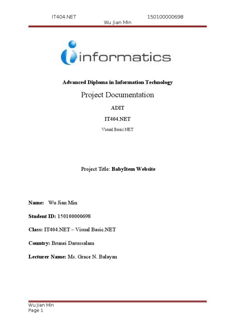 Name: Wu Jian Min Student ID: 150100000698 Class: IT404.NET Visual Basic.NET Country: Brunei Darussalam Lecturer Name: Ms. Grace N. Balayan