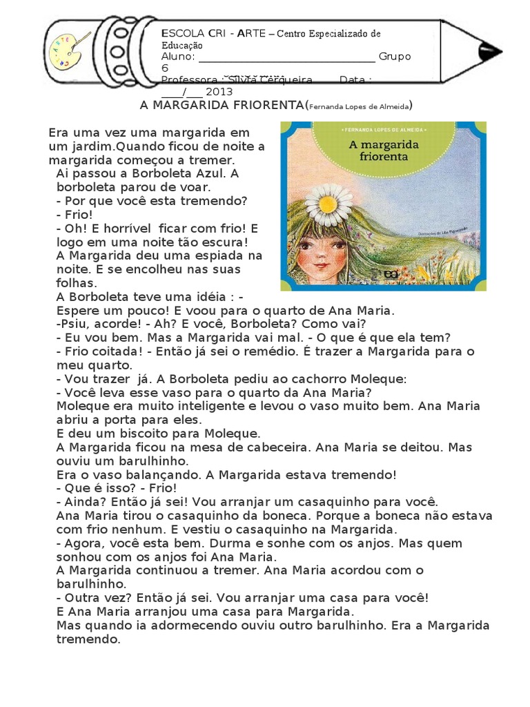 A MARGARIDA FRIORENTA(Fernanda Lopes de Almeida) Era uma vez uma margarida em um jardim.Quando ficou de noite a margarida comeou a tremer. Ai passou a Borboleta Azul. A borboleta parou de voar. - Por que voc esta tremendo? - Frio! - Oh! E horrvel ficar com frio! E logo em uma noite to escura! A Margarida deu uma espiada na noite. E se encolheu nas suas folhas. A Borboleta teve uma idia : Espere um pouco! E voou para o quarto de Ana Maria. -Psiu, acorde! - Ah? E voc, Borboleta? Como vai? - Eu vou bem. Mas a Margarida vai mal. - O que que ela tem? - Frio coitada! - Ento j sei o remdio. trazer a Margarida para o meu quarto. - Vou trazer j. A Borboleta pediu ao cachorro Moleque: - Voc leva esse vaso para o quarto da Ana Maria? Moleque era muito inteligente e levou o vaso muito bem. Ana Maria abriu a porta para eles. E deu um biscoito para Moleque. A Margarida ficou na mesa de cabeceira. Ana Maria se deitou. Mas ouviu um barulhinho. Era o vaso balanando. A Margarida estava tremendo! - Que isso? - Frio! - Ainda? Ento j sei! Vou arranjar um casaquinho para voc. Ana Maria tirou o casaquinho da boneca. Porque a boneca no estava com frio nenhum. E vestiu o casaquinho na Margarida. - Agora, voc esta bem. Durma e sonhe com os anjos. Mas quem sonhou com os anjos foi Ana Maria. A Margarida continuou a tremer. Ana Maria acordou com o barulhinho. - Outra vez? Ento j sei. Vou arranjar uma casa para voc! E Ana Maria arranjou uma casa para Margarida. Mas quando ia adormecendo ouviu outro barulhinho. Era a Margarida tremendo.
