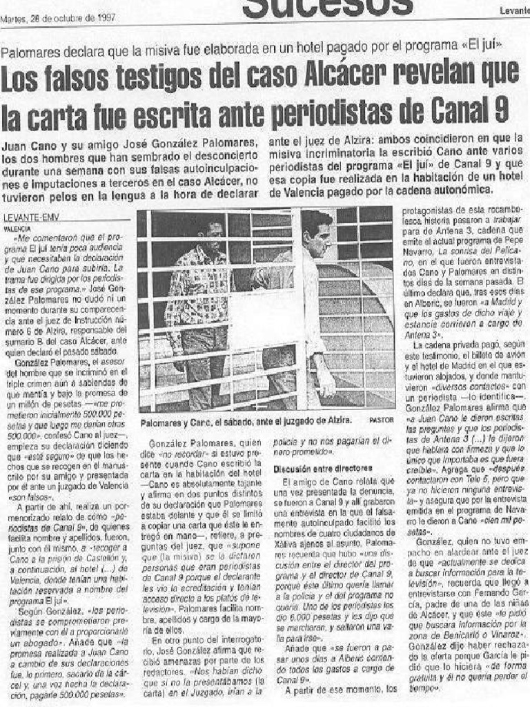 "Los falsos testigos del caso Alcácer [...]" Levante-EMV 28 de Octubre de 1997