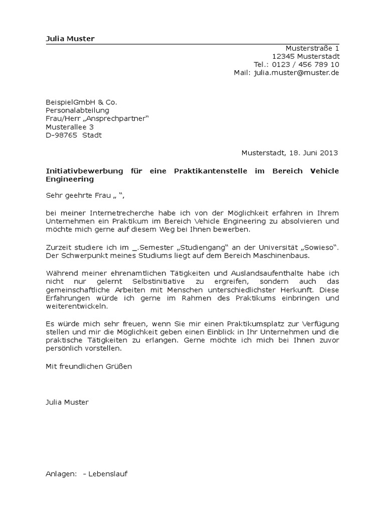 Beispiel m!" # $%. &ers%'ala!teilu'( )rau/"err *+'spre,-part'er. Musterallee 3 /098765 1tadt Musterstadt2 18. 3u'i 2013 Initiativbewerbung Engineering 1e-r (ee-rte )rau * .2 !ei mei'er 4'ter'etre,-er,-e -a!e i,- 5%' der M6(li,-7eit er8a-re' i' 4-rem 9'ter'e-me' ei' &ra7ti7um im Berei,- :e-i,le ;'(i'eeri'( <u a!s%l5iere' u'd m6,-te mi,- (er'e au8 diesem =e( !ei 4-'e' !e>er!e'. ?ur<eit studiere i,- im @.1emester *1tudie'(a'(. a' der 9'i5ersitAt *1%>ies%.. /er 1,->erpu'7t mei'es 1tudiums lie(t au8 dem Berei,- Mas,-i'e'!aus. =A-re'd mei'er e-re'amtli,-e' TAti(7eite' u'd +usla'dsau8e't-alte -a!e i,'i,-t 'ur (eler't 1el!sti'itiati5e <u er(rei8e'2 s%'der' au,- das (emei's,-a8tli,-e +r!eite' mit Me's,-e' u'ters,-iedli,-ster "er7u'8t. /iese ;r8a-ru'(e' >Brde i,- (er'e im Ca-me' des &ra7ti7ums ei'!ri'(e' u'd >eitere't>i,7el'. ;s >Brde mi,- se-r 8reue'2 >e'' 1ie mir ei'e' &ra7ti7umsplat< <ur :er8B(u'( stelle' u'd mir die M6(li,-7eit (e!e' ei'e' ;i'!li,7 i' 4-r 9'ter'e-me' u'd die pra7tis,-e TAti(7eite' <u erla'(e'. er'e m6,-te i,- mi,- !ei 4-'e' <u5%r pers6'li,- 5%rstelle'. Mit 8reu'dli,-e' rBe' fr eine Praktikantenstelle im Bereich Vehicle