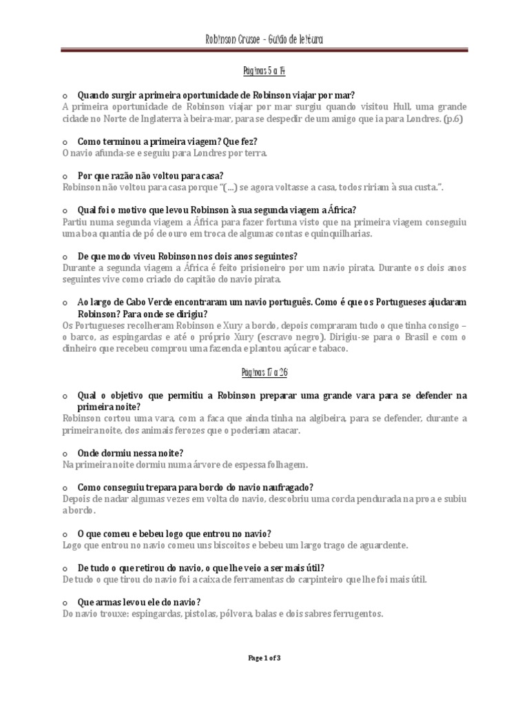 o Quando surgir a primeira oportunidade de Robinson viajar por mar? A primeira oportunidade de Robinson viajar por mar surgiu quando visitou Hull, uma grande cidade no Norte de Inglaterra beira-mar, para se despedir de um amigo que ia para Londres. (p.6) o Como terminou a primeira viagem? Que fez? O navio afunda-se e seguiu para Londres por terra. o Por que razo no voltou para casa? Robinson no voltou para casa porque () se agora voltasse a casa, todos ririam sua custa.. o Qual foi o motivo que levou Robinson sua segunda viagem a frica? Partiu numa segunda viagem a frica para fazer fortuna visto que na primeira viagem conseguiu uma boa quantia de p de ouro em troca de algumas contas e quinquilharias. o De que modo viveu Robinson nos dois anos seguintes? Durante a segunda viagem a frica feito prisioneiro por um navio pirata. Durante os dois anos seguintes vive como criado do capito do navio pirata. Ao largo de Cabo Verde encontraram um navio portugus. Como que os Portugueses ajudaram Robinson? Para onde se dirigiu? Os Portugueses recolheram Robinson e Xury a bordo, depois compraram tudo o que tinha consigo o barco, as espingardas e at o prprio Xury (escravo negro). Dirigiu-se para o Brasil e com o dinheiro que recebeu comprou uma fazenda e plantou acar e tabaco. o