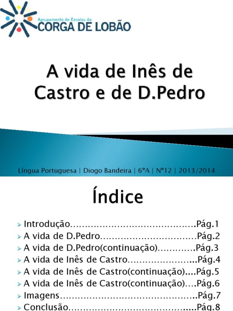Introduo.Pg.1 A vida de D.PedroPg.2 A vida de D.Pedro(continuao).Pg.3 A vida de Ins de Castro...Pg.4 A vida de Ins de Castro(continuao)....Pg.5 A vida de Ins de Castro(continuao).Pg.6 Imagens..Pg.7 Concluso.....Pg.8 BibliografiaPg.9