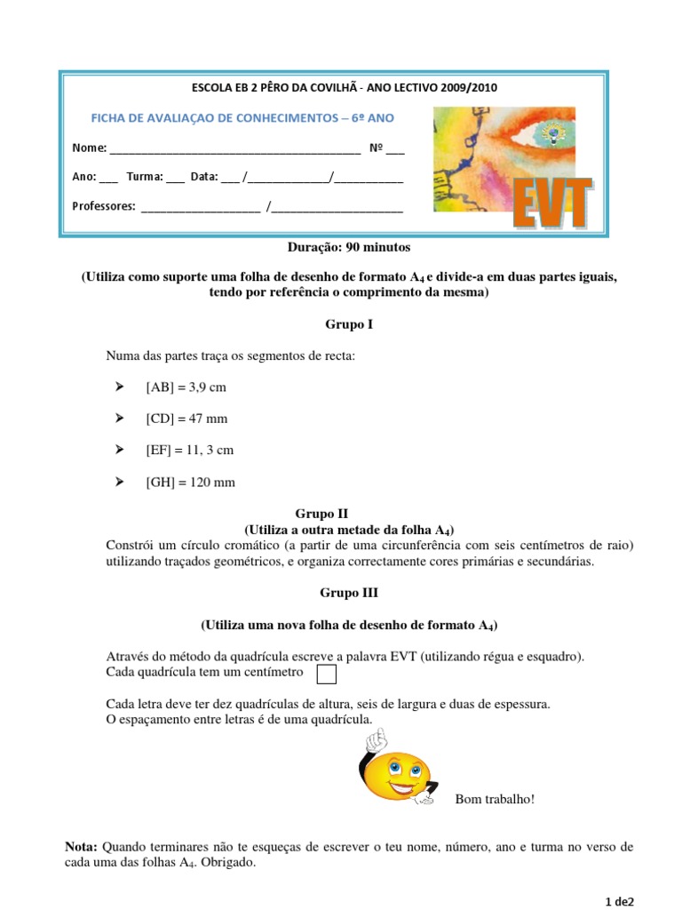 A ficha de avaliação de conhecimentos de Educação Visual e Tecnológica vai apresentar três