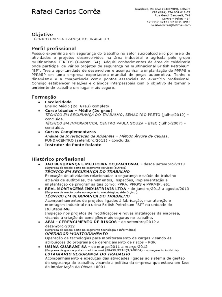 Escolaridade Ensino Mdio (2o. Grau) completo. Curso tcnico Mdio (2o grau) TCNICO EM SEGURANA DO TRABALHO, SENAC RIO PRETO (julho/2012) concluda. TCNICO EM INFORMATICA, CENTRO PAULA SOUZA - ETEC (julho/2007) concluda. Cursos Complementares Anlise de Investigao de Acidentes Mtodo rvore de Causas, FUNDACENTRO (setembro/2011) - concluda. Instrutor de Ponte Rolante