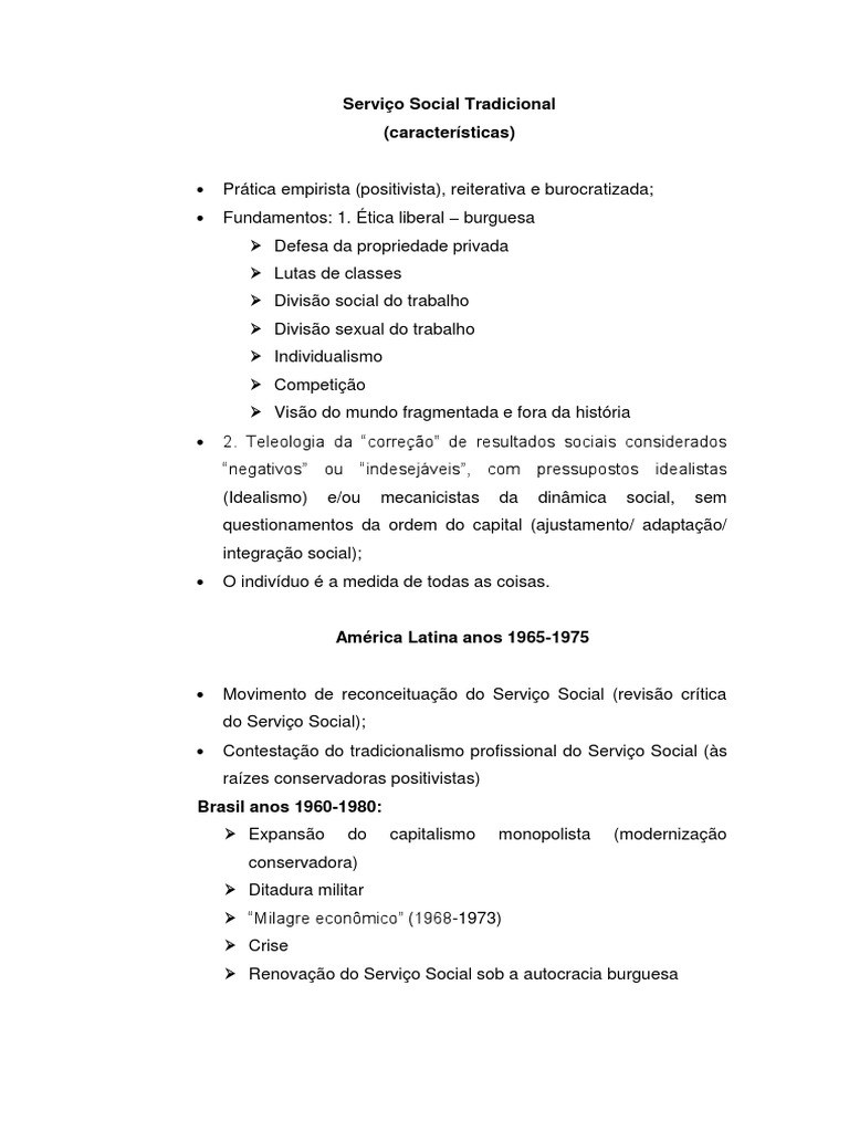 Movimento de reconceituao do Servio Social (reviso crtica do Servio Social); Contestao do tradicionalismo profissional do Servio Social (s razes conservadoras positivistas)