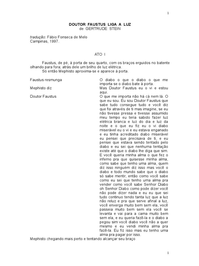 DOUTOR FAUSTUS LIGA A LUZ de GERTRUDE STEIN traduo: Fbio Fonseca de Melo Campinas, 1997. T! I Fa"s#"s, de p$, % po&#a de se" '"a&#o, com os b&a(os e&)"idos no ba#en#e ol*ando pa&a +o&a, a#&s dele "m b&il*o de l"- el$#&ica. S. en#/o Mep*is#o ap&o0ima1se e apa&ece % po&#a. Fa"s#"s &esm"n)a ! diabo o '"e o diabo o '"e me impo&#a se o diabo ba#e % po&#a. Mep*is#o diMas Do"#o& Fa"s#"s e" o 2i e es#o" a'"i. Do"#o& Fa"s#"s ! '"e me impo&#a n/o * c nem l. ! '"e e" so". E" so" Do"#o& Fa"s#"s '"e sabe #"do conse)"e #"do e 2oc3 di'"e +oi a#&a2$s de #i mas ima)ine, se e" n/o #i2esse p&essa e #i2esse ass"mido me" #empo e" #e&ia sabido +a-e& l"el$#&ica b&anca e l"- do dia e l"- da noi#e e o '"e e" +i- e" o 2i diabo mise&2el e" o 2i e e" es#a2a en)anado e e" #in*a ac&edi#ado diabo mise&2el e" pensei '"e p&ecisa2a de #i, e e" pensei '"e es#a2a sendo #en#ado pelo diabo e e" sei '"e nen*"ma #en#a(/o e0is#e a#$ '"e o diabo l*e di)a '"e sim. E 2oc3 '"e&ia min*a alma o '"e +e- o in+e&no p&a '"e '"isesse min*a alma, como sabe '"e #en*o "ma alma, '"em di- isso nin)"$m di- isso mas 2oc3 o diabo e #odo m"ndo sabe '"e o diabo s. sabe men#i&, en#/o como 2oc3 sabe como e" sei '"e #en*o "ma alma p&a 2ende& como 2oc3 sabe Sen*o& Diabo o* Sen*o& Diabo como pode di-e& 2oc3 n/o pode di-e& nada e e" e" '"e sei #"do con#in"o #endo #an#a l"- '"e a l"n/o &el"- e p&a '"e se&2e a+inal a l"-, 2oc3 en0e&)a m"i#o bem sem ela, 2oc3 passeia m"i#o bem sem ela 2oc3 se le2an#a e 2ai pa&a a cama m"i#o bem sem ela, e e" '"e&ia +a-31la e o diabo a pe)o" sim 2oc3 diabo 2oc3 n/o a '"e& mesmo e e" 2endi min*a alma p&a +a-31la. E" +i- isso mas e" #en*o "ma alma p&a pa)a& po& isso. Mep*is#o c*e)ando mais pe&#o e #en#ando alcan(a& se" b&a(o