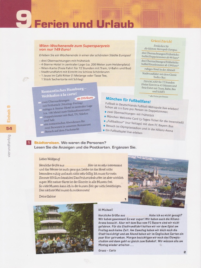 Lesen Sie die Anzeigen und die Postkarten. Ergiinzen Sie.