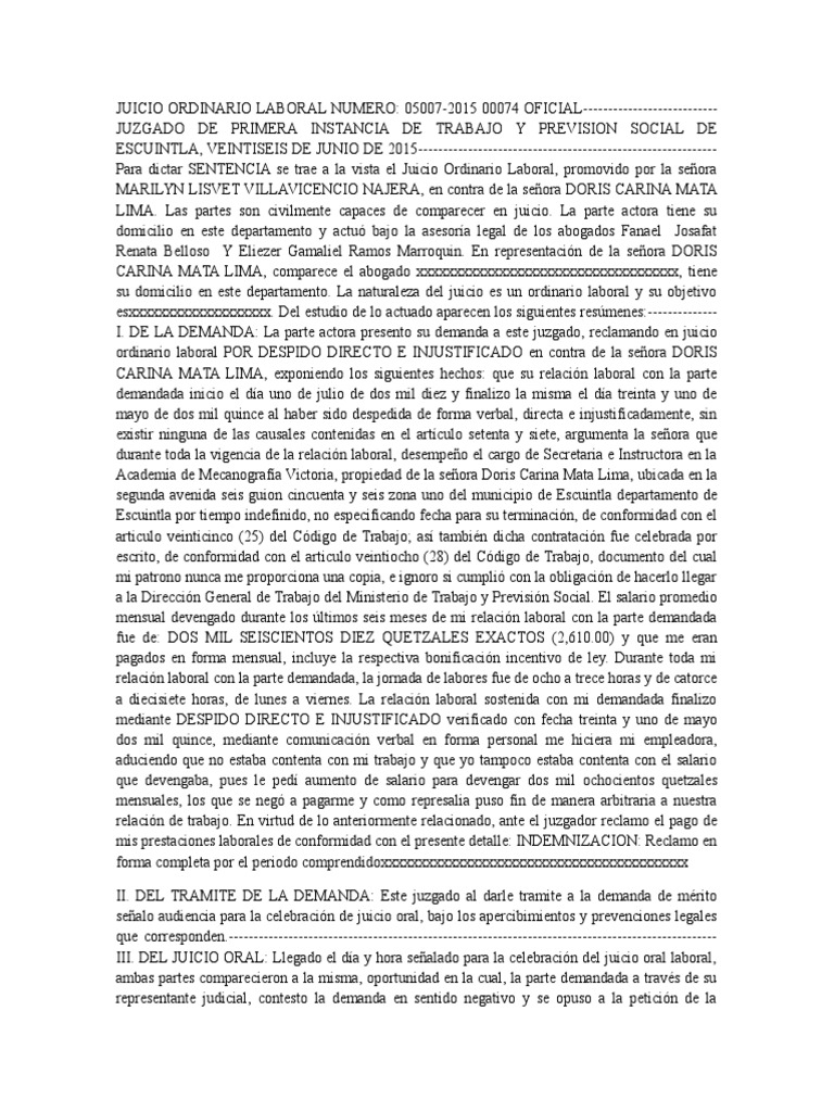 Mata Lima, al afirmar que fue objeto de despido directo e injustificado. Por otro lado la seora