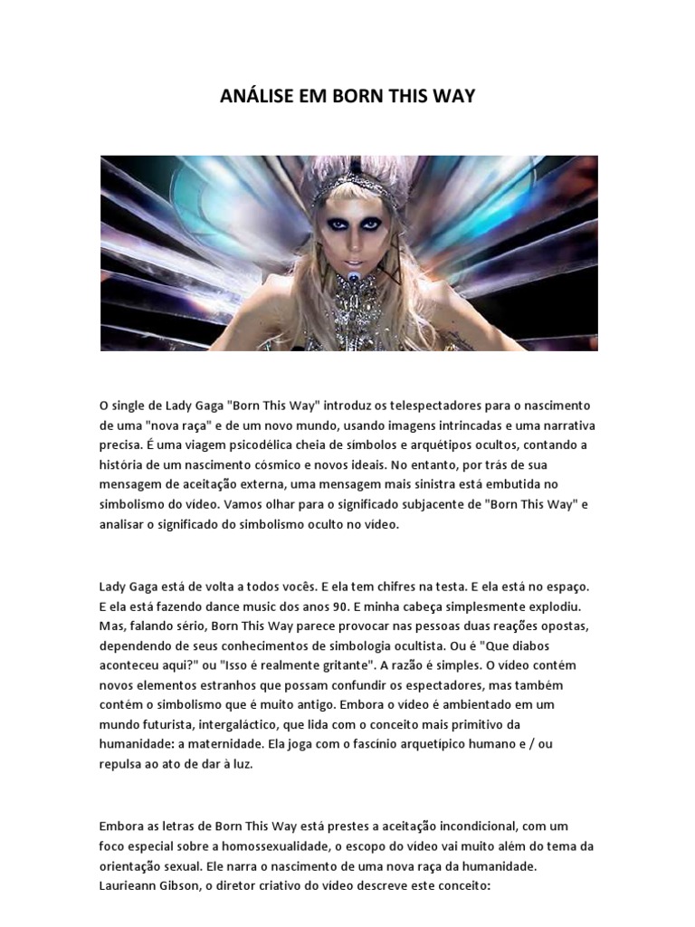 O single de Lady Gaga "Born This Way" introduz os telespectadores para o nascimento de uma "nova raa" e de um novo mundo, usando imagens intrincadas e uma narrativa precisa. uma viagem psicodlica cheia de smbolos e arqutipos ocultos, contando a histria de um nascimento csmico e novos ideais. No entanto, por trs de sua mensagem de aceitao externa, uma mensagem mais sinistra est embutida no simbolismo do vdeo. Vamos olhar para o significado subjacente de "Born This Way" e analisar o significado do simbolismo oculto no vdeo.