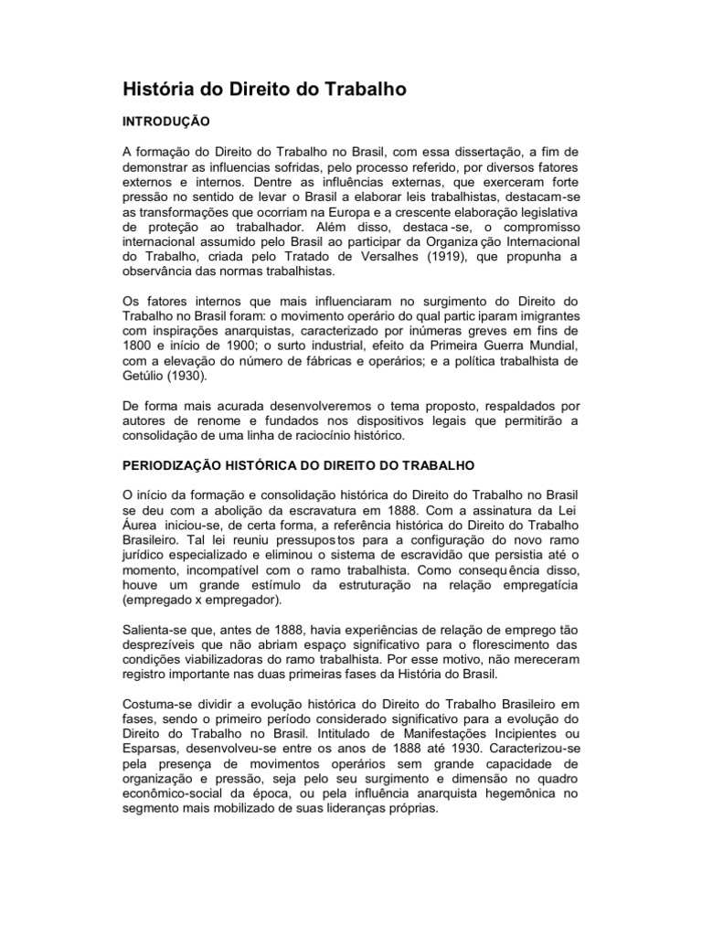 A formao do Direito do Trabalho no Brasil, com essa dissertao, a fim de demonstrar as influencias sofridas, pelo processo referido, por diversos fatores externos e internos. Dentre as influncias externas, que exerceram forte presso no sentido de levar o Brasil a elaborar leis trabalhistas, destacam-se as transformaes que ocorriam na Europa e a crescente elaborao legislativa de proteo ao trabalhador. Alm disso, destaca -se, o compromisso internacional assumido pelo Brasil ao participar da Organiza o Internacional do Trabalho, criada pelo Tratado de Versalhes (1919), que propunha a observncia das normas trabalhistas. Os fatores internos que mais influenciaram no surgimento do Direito do Trabalho no Brasil foram: o movimento operrio do qual partic iparam imigrantes com inspiraes anarquistas, caracterizado por inmeras greves em fins de 1800 e incio de 1900; o surto industrial, efeito da Primeira Guerra Mundial, com a elevao do nmero de fbricas e operrios; e a poltica trabalhista de Getlio (1930). De forma mais acurada desenvolveremos o tema proposto, respaldados por autores de renome e fundados nos dispositivos legais que permitiro a consolidao de uma linha de raciocnio histrico.