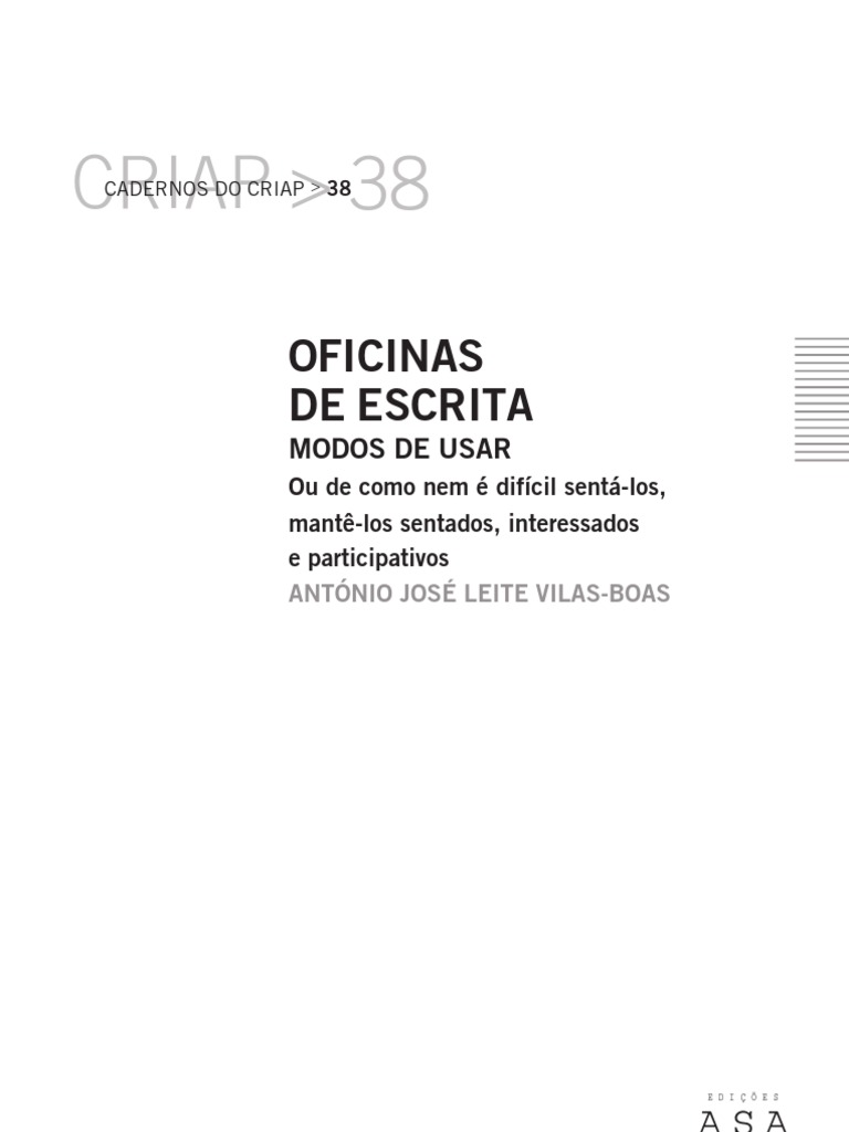 TTULO OFICINAS DE ESCRITA: MODOS DE USAR AUTOR Antnio Jos Leite Vilas-Boas COLECO Cadernos do CRIAP CONTACTOS COM O AUTOR antonio-vilas-boas@clix.pt 963046602/229672060 DIRECO Jos Matias Alves DESIGN XP design CAPA Xavier Neves EXECUO GRFICA GRAFIASA