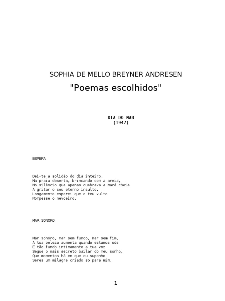 Mar sonoro, mar sem fundo, mar sem fim, A tua beleza aumenta quando estamos ss E to fundo intimamente a tua voz Segue o mais secreto bailar do meu sonho, Que momentos h em que eu suponho Seres um milagre criado s para mim.