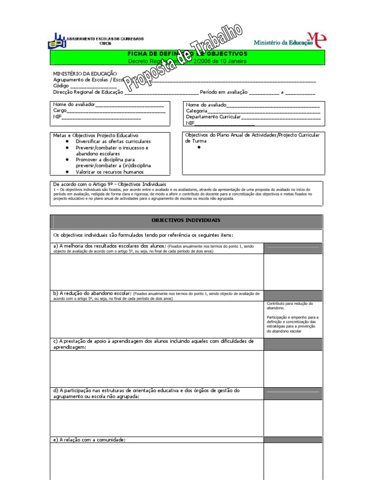 1 ñ Os objectivos individuais s„o fixados, por acordo entre o avaliado e os avaliadores, atravÈs da apresentaÁ„o de uma proposta do avaliado no inÌcio do perÌodo em avaliaÁ„o, redigida de forma clara e rigorosa, de modo a aferir o contributo do docente para a concretizaÁ„o dos objectivos e metas fixados no projecto educativo e no plano anual de actividades para o agrupamento de escolas ou escola n„o agrupada.