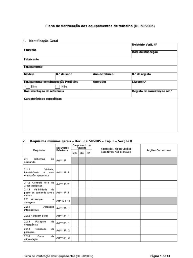 Relatrio Verif. N Empresa Fabricante Equipamento Modelo N. de srie Ano de fabrico Operador N. de registo Livrete n. Registo de manuteno ref. Data de Inspeco