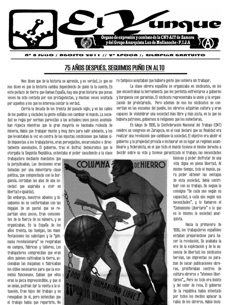 Nos dicen que de la historia se aprende, y es verdad. Lo que no nos dicen es que la historia cambia dependiendo de quin te la cuente. En este pedazo de tierra que llaman Espaa, hay una gran historia que pocas veces ha sido contada por sus protagonistas, y muchas veces ocultada por aquellos a los que no interesa contar la verdad. Corra la dcada de los treinta del pasado siglo, y en las calles de los pueblos y ciudades la gente soaba con cambiar el mundo. La sociedad se rega por normas parecidas a las actuales: unos pocos acumulaban riqueza mientras que la gran mayora se hacinaba rodeada de miseria. Haba que trabajar mucho y muy duro para salir adelante, y los que levantaban la voz en contra de las injustas condiciones que haban sido impuestas a los trabajadores, eran perseguidos, encarcelados o directamente asesinados. El gobierno, tras el disfraz democrtico que le otorgaba la Segunda Repblica, ostentaba el poder sacudiendo a la clase trabajadora mediante mandatos que la perjudicaban. Las decisiones eran tomadas por una minoritaria clase poltica, que compinchada con la burguesa, cortaban las alas de una sociedad que aspiraba a vivir en libertad e igualdad. Sin embargo, nuestros abuelos y bisabuelos no se conformaban con las migajas de un pastel que se repartan unos pocos. Eran conscientes de la fuerza de su nmero, y se organizaban. En la Espaa de los aos treinta, las huelgas, las manifestaciones los sabotajes y la gimnasia revolucionaria se respiraban en campos, fbricas y talleres. Los trabajadores comprendan que eran ellos quienes cultivaban la tierra, accionaban las mquinas o fabricaban los tiles necesarios para que la economa funcionase. Saban que ellos eran la pieza imprescindible, y que si se unan, podran dar la vuelta a la situacin. Eran hijos del trabajo y no renegaban de l, pero entendan que el trabajo haba que repartirlo. No aceptaban trabajar de sol a sol, pero tampoco aceptaban que hubiera gente que comiera sin trabajar. La clase obrera espaola se organizaba en sindicatos, en los que encontraban la herramienta que les permita enfrentarse a gobierno y burguesa con garantas. El sindicato representaba la unin y la organizacin del proletariado. Pero adems de eso los sindicatos se convertan en las escuelas del pueblo, los obreros adquiran cultura y eran capaces de vislumbrar una sociedad ms libre y ms justa, en la que no hubiera patrones, gobiernos ni religiones que los sometieran. En Mayo de 1936, la Confederacin Nacional del Trabajo (CNT) celebr un congreso en Zaragoza, en el cual declar que su finalidad era realizar una revolucin que cambiase la sociedad. El objetivo era abolir el gobierno y la propiedad privada e instaurar en su lugar un rgimen asambleario y federalista, en el que todo el mundo tuviese el mismo derecho a decidir sobre su vida y tuviese garantizado el trabajo, las necesidades bsicas y poder disfrutar de una vida digna en plena libertad. Al mismo tiempo, todo el mundo, para poder obtener las ventajas de esta sociedad, deba contribuir con su trabajo. Se segua la consigna de cada uno segn su capacidad, a cada uno segn sus necesidades, y lo llamaron el Comunismo Libertario o lo que es lo mismo: la sociedad anarquista. Hacia la primavera de 1936, los trabajadores espaoles estaban preparndose para hacer la revolucin. Se acababa la era de la explotacin y de la ausencia de libertad: los sindicatos hervan, las imprentas no paraban de sacar publicaciones obreras, proliferaban centros de cultura obreros o ateneos libertarios Pero no todo era bonito y del color de rosa. El gobierno de la repblica haba intentado por todos los medios aplacar la rabia de los obreros. Haba incluso llegado a cometer crmenes imperdonables como los sucesos