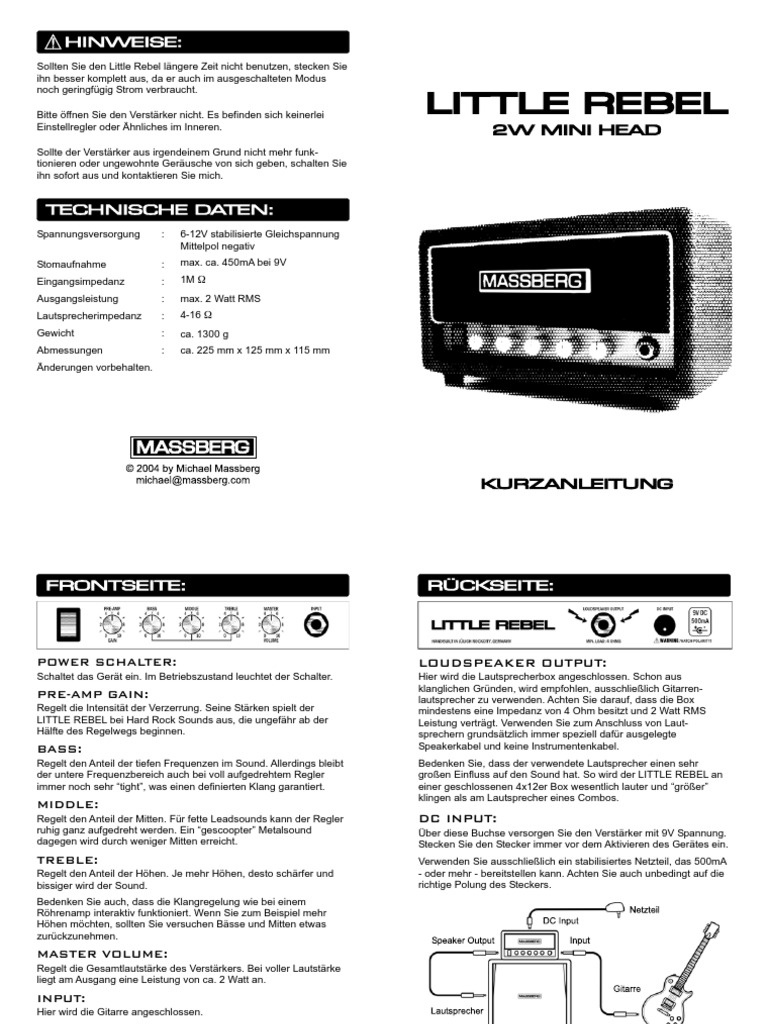 da er auch im ausgeschalteten Modus noch geringfgig Strom verbraucht. Bitte ffnen Sie den Verstrker nicht. Es befinden sich keinerlei Einstellregler oder hnliches im Inneren. Sollte der Verstrker aus irgendeinem Grund nicht mehr funktionieren oder ungewohnte Gerusche von sich geben, schalten Sie ihn sofort aus und kontaktieren Sie mich.