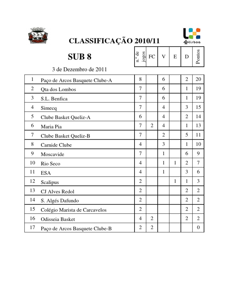 1 2 3 4 5 6 7 8 9 10 11 12 13 14 15 16 17 Pao de Arcos Basquete Clube-A Qta dos Lombos S.L. Benfica Simecq Clube Basket Queliz-A Maria Pia Clube Basket Queliz-B Carnide Clube Moscavide Rio Seco ESA Scalipus CJ Alves Redol S. Algs Dafundo Colgio Marista de Carcavelos Odisseia Basket Pao de Arcos Basquete Clube-B
