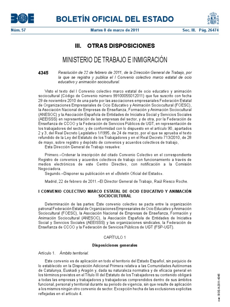 Visto el texto del I Convenio colectivo marco estatal de ocio educativo y animacin sociocultural (Cdigo de Convenio nmero 99100055012011) que fue suscrito con fecha 29 de noviembre 2010 de una parte por las asociaciones empresariales Federacin Estatal de Organizaciones Empresariales de Ocio Educativo y Animacin Sociocultural (FOESC), la Asociacin Nacional de Empresas de Enseanza, Formacin y Animacin Sociocultural (ANESOC) y la Asociacin Espaola de Entidades de Iniciativa Social y Servicios Sociales (AEEISSS) en representacin de las empresas del sector, y de otra, por la Federacin de Enseanza de CCOO y la Federacin de Servicios Pblicos de UGT, en representacin de los trabajadores del sector, y de conformidad con lo dispuesto en el artculo 90, apartados 2 y 3, del Real Decreto Legislativo 1/1995, de 24 de marzo, por el que se aprueba el texto refundido de la Ley del Estatuto de los Trabajadores y en el Real Decreto 713/2010, de 28 de mayo, sobre registro y depsito de convenios y acuerdos colectivos de trabajo, Esta Direccin General de Trabajo resuelve: Primero.Ordenar la inscripcin del citado Convenio Colectivo en el correspondiente Registro de convenios y acuerdos colectivos de trabajo con funcionamiento a travs de medios electrnicos de este Centro Directivo, con notificacin a la Comisin Negociadora. Segundo.Disponer su publicacin en el Boletn Oficial del Estado. Madrid, 22 de febrero de 2011.El Director General de Trabajo, Ral Riesco Roche. I CONVENIO COLECTIVO MARCO ESTATAL DE OCIO EDUCATIVO Y ANIMACIN SOCIOCULTURAL Determinacin de las partes: Este convenio colectivo se pacta entre la organizacin patronal Federacin Estatal de Organizaciones Empresariales de Ocio Educativo y Animacin Sociocultural (FOESC), la Asociacin Nacional de Empresas de Enseanza, Formacin y Animacin Sociocultural (ANESOC), la Asociacin Espaola de Entidades de Iniciativa Social y Servicios Sociales (AEEISSS) y las organizaciones sindicales, la Federacin de Enseanza de CCOO y la Federacin de Servicios Pblicos de UGT (FSP-UGT). CAPTULO 1 Disposiciones generales Artculo 1. mbito territorial. Este convenio es de aplicacin en todo el territorio del Estado Espaol, sin perjuicio de lo establecido en la Disposicin Adicional Primera relativa a las Comunidades Autnomas de Catalunya, Euskadi y Aragn y, dada su naturaleza normativa y de eficacia general en los trminos previstos en el Ttulo III del Estatuto de los Trabajadores su contenido obligar a todas las empresas y trabajadores y trabajadoras comprendidos dentro de sus mbitos funcional, personal y territorial durante su periodo de vigencia, sin que resulte de aplicacin a los mismos ningn otro convenio de sector. Excepcin hecha de las exclusiones explicitas reflejadas en el artculo 4.