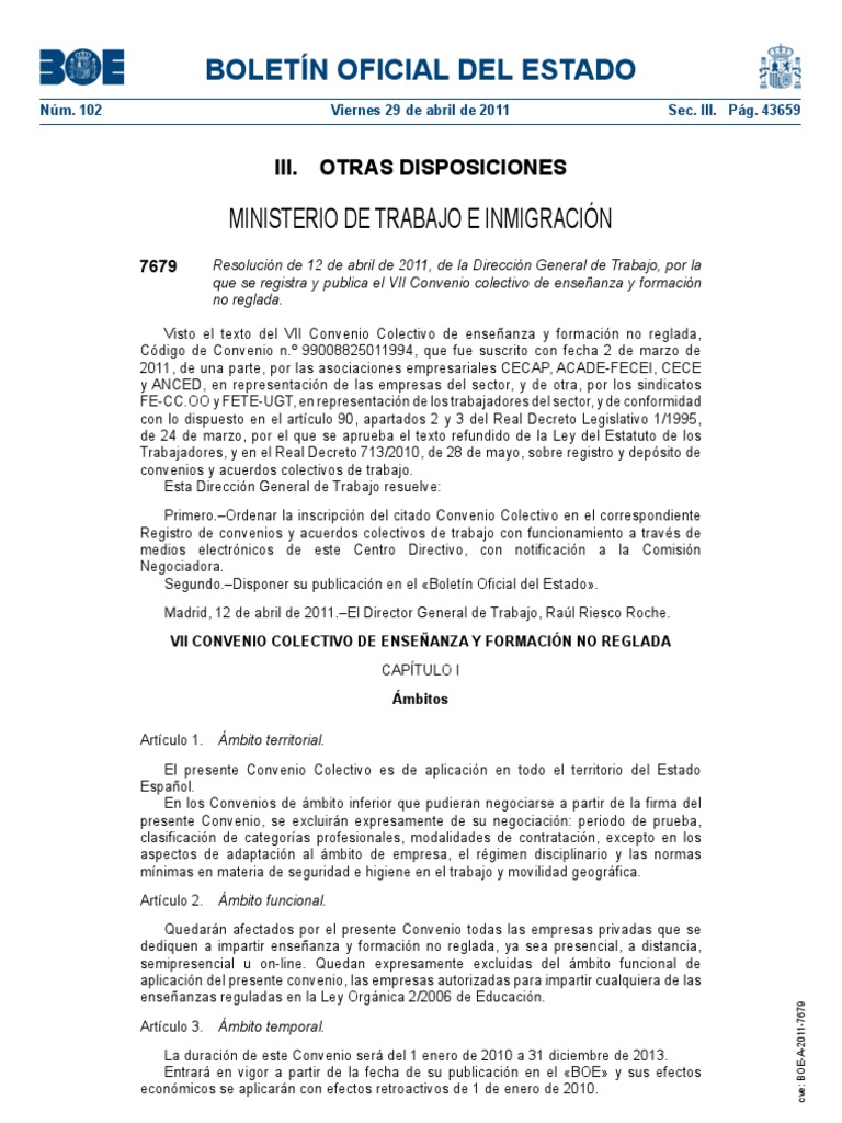 Visto el texto del VII Convenio Colectivo de enseanza y formacin no reglada, Cdigo de Convenio n. 99008825011994, que fue suscrito con fecha 2 de marzo de 2011, de una parte, por las asociaciones empresariales CECAP, ACADE-FECEI, CECE y ANCED, en representacin de las empresas del sector, y de otra, por los sindicatos FE-CC.OO y FETE-UGT, en representacin de los trabajadores del sector, y de conformidad con lo dispuesto en el artculo 90, apartados 2 y 3 del Real Decreto Legislativo 1/1995, de 24 de marzo, por el que se aprueba el texto refundido de la Ley del Estatuto de los Trabajadores, y en el Real Decreto 713/2010, de 28 de mayo, sobre registro y depsito de convenios y acuerdos colectivos de trabajo. Esta Direccin General de Trabajo resuelve: Primero.Ordenar la inscripcin del citado Convenio Colectivo en el correspondiente Registro de convenios y acuerdos colectivos de trabajo con funcionamiento a travs de medios electrnicos de este Centro Directivo, con notificacin a la Comisin Negociadora. Segundo.Disponer su publicacin en el Boletn Oficial del Estado. Madrid, 12 de abril de 2011.El Director General de Trabajo, Ral Riesco Roche. VII CONVENIO COLECTIVO DE ENSEANZA Y FORMACIN NO REGLADA CAPTULO I mbitos Artculo 1. mbito territorial. El presente Convenio Colectivo es de aplicacin en todo el territorio del Estado Espaol. En los Convenios de mbito inferior que pudieran negociarse a partir de la firma del presente Convenio, se excluirn expresamente de su negociacin: periodo de prueba, clasificacin de categoras profesionales, modalidades de contratacin, excepto en los aspectos de adaptacin al mbito de empresa, el rgimen disciplinario y las normas mnimas en materia de seguridad e higiene en el trabajo y movilidad geogrfica. Artculo 2. mbito funcional. Quedarn afectados por el presente Convenio todas las empresas privadas que se dediquen a impartir enseanza y formacin no reglada, ya sea presencial, a distancia, semipresencial u on-line. Quedan expresamente excluidas del mbito funcional de aplicacin del presente convenio, las empresas autorizadas para impartir cualquiera de las enseanzas reguladas en la Ley Orgnica 2/2006 de Educacin. Artculo 3. mbito temporal. La duracin de este Convenio ser del 1 enero de 2010 a 31 diciembre de 2013. Entrar en vigor a partir de la fecha de su publicacin en el BOE y sus efectos econmicos se aplicarn con efectos retroactivos de 1 de enero de 2010.