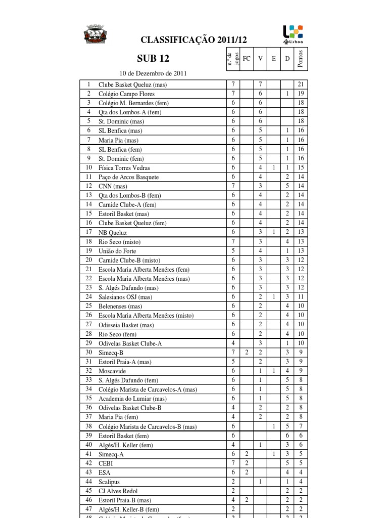 1 2 3 4 5 6 7 8 9 10 11 12 13 14 15 16 17 18 19 20 21 22 23 24 25 26 27 28 29 30 31 32 33 34 35 36 37 38 39 40 41 42 43 44 45 46 47 48 Clube Basket Queluz (mas) Colgio Campo Flores Colgio M. Bernardes (fem) Qta dos Lombos-A (fem) St. Dominic (mas) SL Benfica (mas) Maria Pia (mas) SL Benfica (fem) St. Dominic (fem) Fsica Torres Vedras Pao de Arcos Basquete CNN (mas) Qta dos Lombos-B (fem) Carnide Clube-A (fem) Estoril Basket (mas) Clube Basket Queluz (fem) NB Queluz Rio Seco (misto) Unio do Forte Carnide Clube-B (misto) Escola Maria Alberta Menres (fem) Escola Maria Alberta Menres (mas) S. Algs Dafundo (mas) Salesianos OSJ (mas) Belenenses (mas) Escola Maria Alberta Menres (misto) Odisseia Basket (mas) Rio Seco (fem) Odivelas Basket Clube-A Simecq-B Estoril Praia-A (mas) Moscavide S. Algs Dafundo (fem) Colgio Marista de Carcavelos-A (mas) Academia do Lumiar (mas) Odivelas Basket Clube-B Maria Pia (fem) Colgio Marista de Carcavelos-B (mas) Estoril Basket (fem) Algs/H. Keller (fem) Simecq-A CEBI ESA Scalipus CJ Alves Redol Estoril Praia-B (mas) Algs/H. Keller-B (fem) Colgio Marista de Carcavelos (fem)