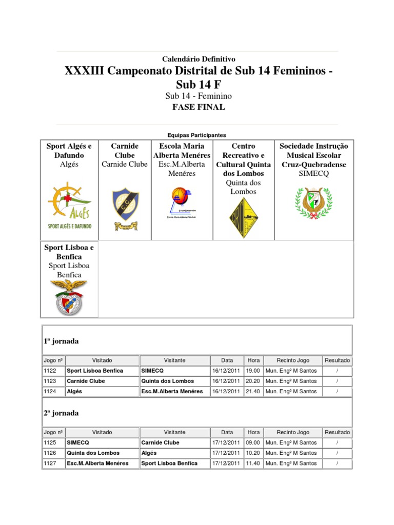 Jogo n 1125 1126 1127 SIMECQ Quinta dos Lombos Esc.M.Alberta Menres Visitado Visitante Carnide Clube Algs Sport Lisboa Benfica Data 17/12/2011 17/12/2011 17/12/2011 Hora 09.00 10.20 11.40 Recinto Jogo Mun. Eng M Santos Mun. Eng M Santos Mun. Eng M Santos Resultado / / /