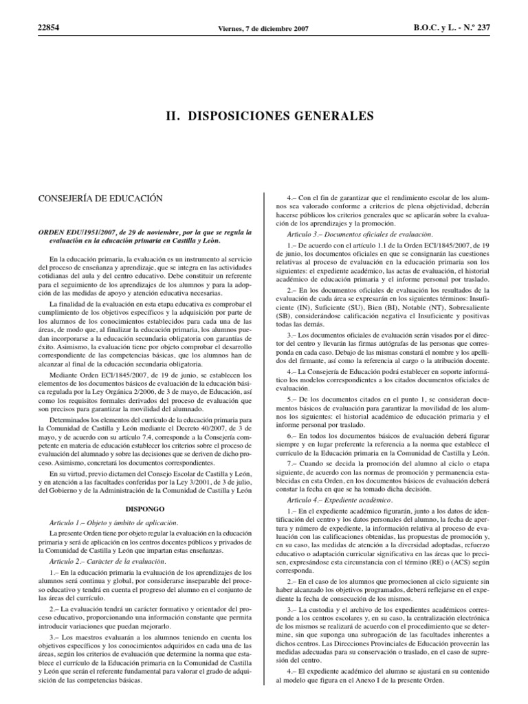 ORDEN EDU/1951/2007, de 29 de noviembre, por la que se regula la evaluacin en la educacin primaria en Castilla y Len. En la educacin primaria, la evaluacin es un instrumento al servicio del proceso de enseanza y aprendizaje, que se integra en las actividades cotidianas del aula y del centro educativo. Debe constituir un referente para el seguimiento de los aprendizajes de los alumnos y para la adopcin de las medidas de apoyo y atencin educativa necesarias. La finalidad de la evaluacin en esta etapa educativa es comprobar el cumplimiento de los objetivos especficos y la adquisicin por parte de los alumnos de los conocimientos establecidos para cada una de las reas, de modo que, al finalizar la educacin primaria, los alumnos puedan incorporarse a la educacin secundaria obligatoria con garantas de xito. Asimismo, la evaluacin tiene por objeto comprobar el desarrollo correspondiente de las competencias bsicas, que los alumnos han de alcanzar al final de la educacin secundaria obligatoria. Mediante Orden ECI/1845/2007, de 19 de junio, se establecen los elementos de los documentos bsicos de evaluacin de la educacin bsica regulada por la Ley Orgnica 2/2006, de 3 de mayo, de Educacin, as como los requisitos formales derivados del proceso de evaluacin que son precisos para garantizar la movilidad del alumnado. Determinados los elementos del currculo de la educacin primaria para la Comunidad de Castilla y Len mediante el Decreto 40/2007, de 3 de mayo, y de acuerdo con su artculo 7.4, corresponde a la Consejera competente en materia de educacin establecer los criterios sobre el proceso de evaluacin del alumnado y sobre las decisiones que se deriven de dicho proceso. Asimismo, concretar los documentos correspondientes. En su virtud, previo dictamen del Consejo Escolar de Castilla y Len, y en atencin a las facultades conferidas por la Ley 3/2001, de 3 de julio, del Gobierno y de la Administracin de la Comunidad de Castilla y Len DISPONGO Artculo 1. Objeto y mbito de aplicacin. La presente Orden tiene por objeto regular la evaluacin en la educacin primaria y ser de aplicacin en los centros docentes pblicos y privados de la Comunidad de Castilla y Len que impartan estas enseanzas. Artculo 2. Carcter de la evaluacin. 1. En la educacin primaria la evaluacin de los aprendizajes de los alumnos ser continua y global, por considerarse inseparable del proceso educativo y tendr en cuenta el progreso del alumno en el conjunto de las reas del currculo. 2. La evaluacin tendr un carcter formativo y orientador del proceso educativo, proporcionando una informacin constante que permita introducir variaciones que puedan mejorarlo. 3. Los maestros evaluarn a los alumnos teniendo en cuenta los objetivos especficos y los conocimientos adquiridos en cada una de las reas, segn los criterios de evaluacin que determine la norma que establece el currculo de la Educacin primaria en la Comunidad de Castilla y Len que sern el referente fundamental para valorar el grado de adquisicin de las competencias bsicas.