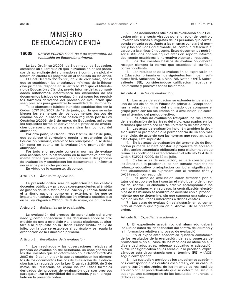 Disposicin final segunda. rganos de referencia. Para los centros espaoles en el exterior, las referencias que en la presente orden se hacen a la Inspeccin educativa se entendern hechas a la Inspeccin educativa del Departamento, integrada en la Subdireccin General de Centros, Programas e Inspeccin Educativa. Disposicin final tercera. Entrada en vigor. La presente orden entrar en vigor el da siguiente al de su publicacin en el Boletn Oficial del Estado. Madrid, 4 de septiembre de 2007.La Ministra de Educacin y Ciencia, Mercedes Cabrera Calvo-Sotelo.