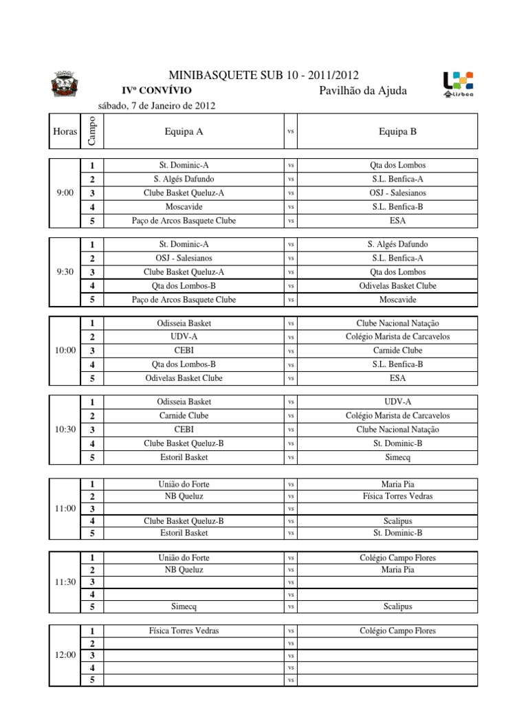 Qta dos Lombos S.L. Benfica-A OSJ - Salesianos S.L. Benfica-B ESA S. Algs Dafundo S.L. Benfica-A Qta dos Lombos Odivelas Basket Clube Moscavide Clube Nacional Natao Colgio Marista de Carcavelos Carnide Clube S.L. Benfica-B ESA UDV-A Colgio Marista de Carcavelos Clube Nacional Natao St. Dominic-B Simecq Maria Pia Fsica Torres Vedras Scalipus St. Dominic-B Colgio Campo Flores Maria Pia