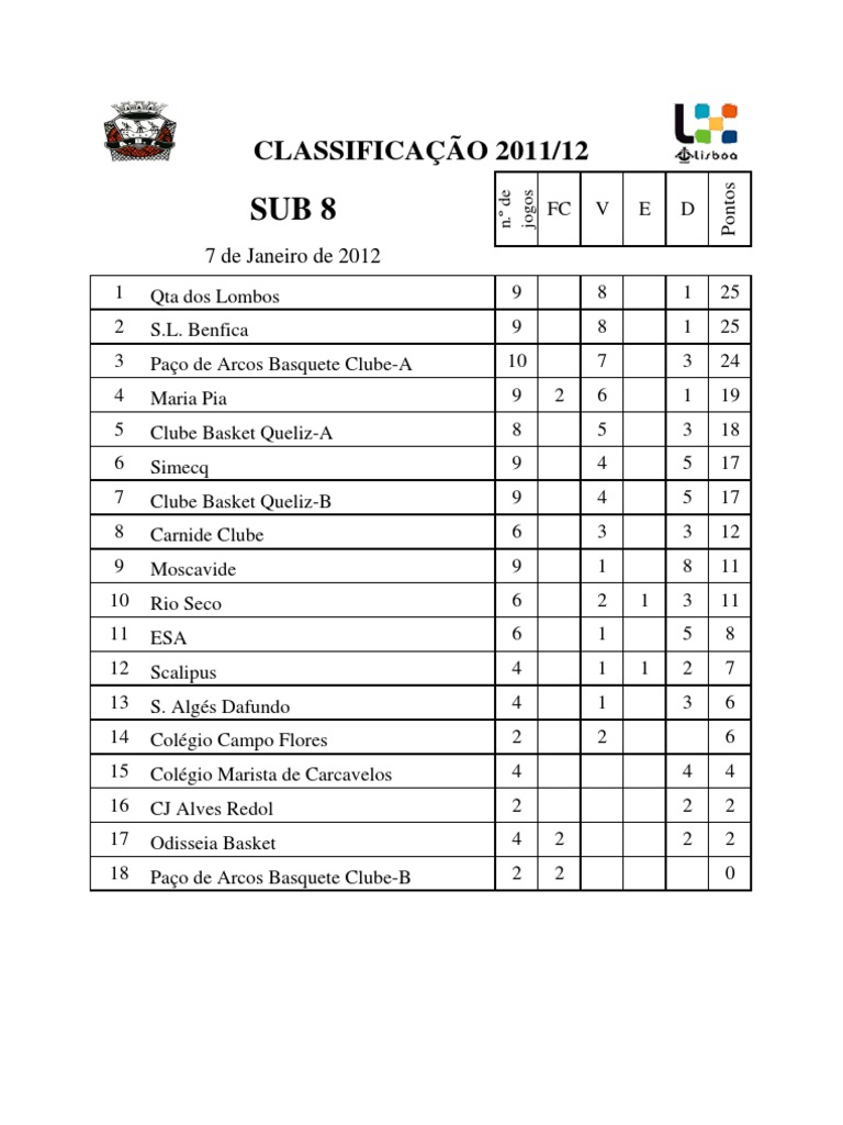 1 2 3 4 5 6 7 8 9 10 11 12 13 14 15 16 17 18 Qta dos Lombos S.L. Benfica Pao de Arcos Basquete Clube-A Maria Pia Clube Basket Queliz-A Simecq Clube Basket Queliz-B Carnide Clube Moscavide Rio Seco ESA Scalipus S. Algs Dafundo Colgio Campo Flores Colgio Marista de Carcavelos CJ Alves Redol Odisseia Basket Pao de Arcos Basquete Clube-B