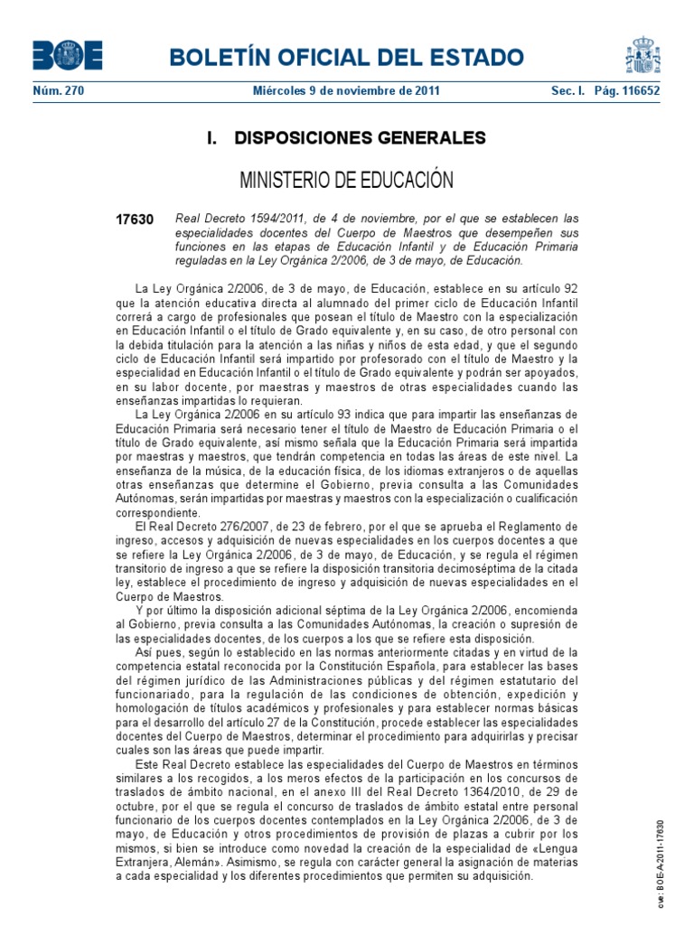 Real Decreto 1594/2011, de 4 de noviembre, por el que se establecen las especialidades docentes del Cuerpo de Maestros que desempeen sus funciones en las etapas de Educacin Infantil y de Educacin Primaria reguladas en la Ley Orgnica 2/2006, de 3 de mayo, de Educacin.