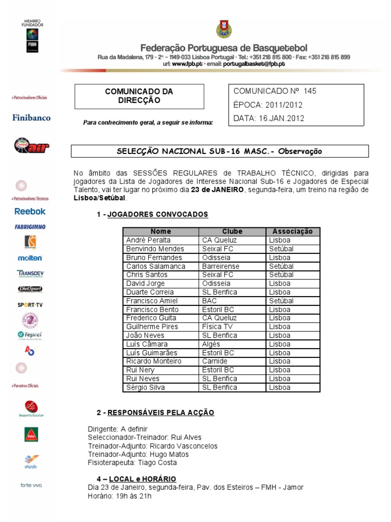 5 NOTAS a) Todos os jogadores devero munir-se de equipamento de treino adequado. b) Dada a proximidade, a FPB no comparticipa o valor das deslocaes salvo situaes excepcionais, que sero resolvidas caso a caso. c) Esto convidados a assistir aos treinos todos os Treinadores, nomeadamente os dos escales de formao, colocando-se os seleccionadores ao seu dispor, para dialogar, antes e depois de cada sesso. Todos os jogadores devem contactar Hugo Matos (talentos.masc@fpb.pt / 969105514) a fim de confirmar a presena. Estes so tambm os contactos para o esclarecimento de qualquer dvida. Lisboa, 16 de Janeiro de 2012 A DIRECO