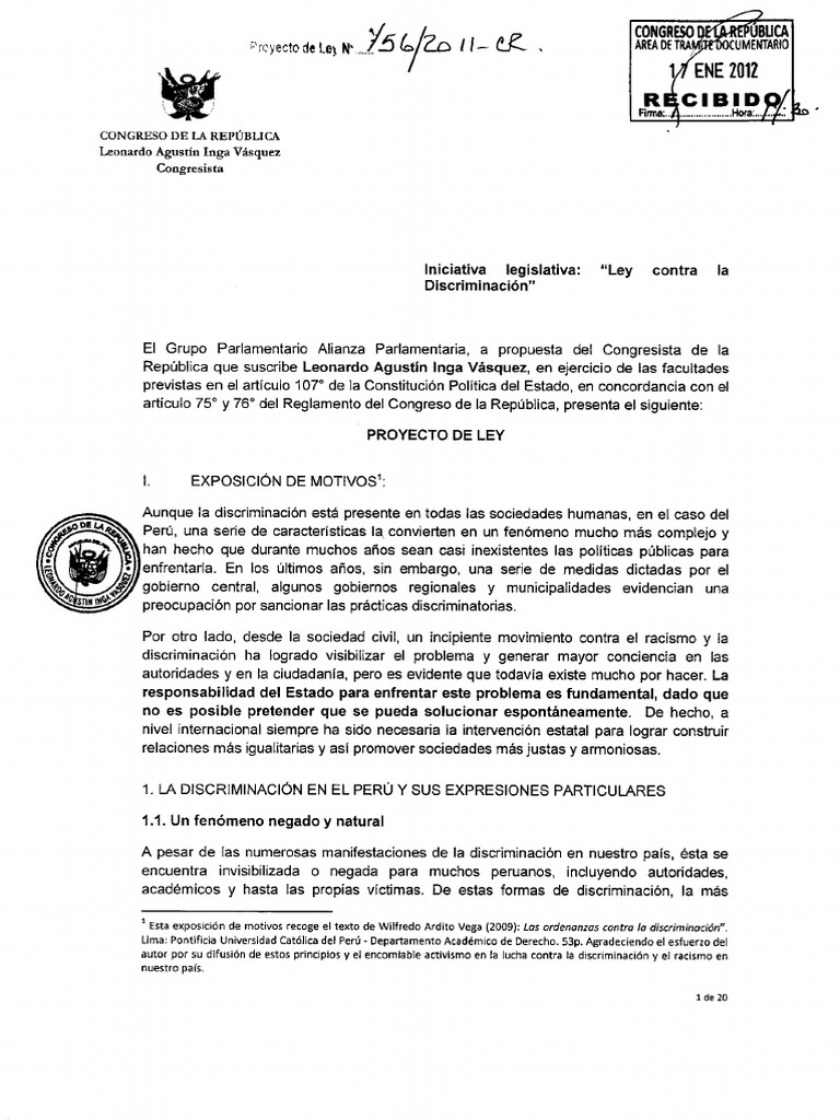 Proyecto de "Ley contra la discriminación", presentado por el Congresista Leonardo Inga Vásquez.