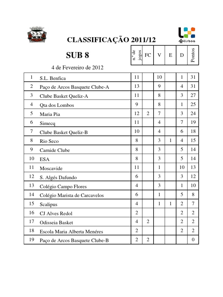 1 2 3 4 5 6 7 8 9 10 11 12 13 14 15 16 17 18 19 S.L. Benfica Pao de Arcos Basquete Clube-A Clube Basket Queliz-A Qta dos Lombos Maria Pia Simecq Clube Basket Queliz-B Rio Seco Carnide Clube ESA Moscavide S. Algs Dafundo Colgio Campo Flores Colgio Marista de Carcavelos Scalipus CJ Alves Redol Odisseia Basket Escola Maria Alberta Menres Pao de Arcos Basquete Clube-B