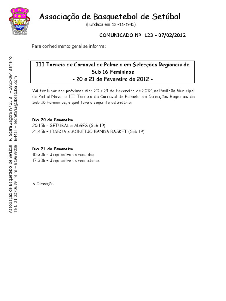 III Torneio de Carnaval de Palmela em Seleces Regionais de Sub 16 Femininos - 20 e 21 de Fevereiro de 2012 Vai ter lugar nos prximos dias 20 e 21 de Fevereiro de 2012, no Pavilho Municipal do Pinhal Novo, o III Torneio de Carnaval de Palmela em Seleces Regionais de Sub 16 Femininos, o qual ter o seguinte calendrio: