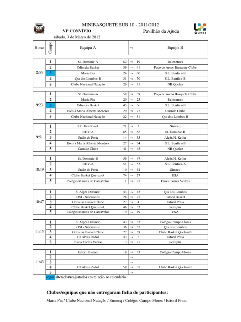 St. Dominic-A Odisseia Basket Maria Pia Qta dos Lombos-B Clube Nacional Natao St. Dominic-A Maria Pia Odisseia Basket Escola Maria Alberta Menres Clube Nacional Natao S.L. Benfica-A UDV-A Unio do Forte Escola Maria Alberta Menres Carnide Clube St. Dominic-B UDV-A Unio do Forte Clube Basket Queluz-A Colgio Marista de Carcavelos S. Algs Dafundo OSJ - Salesianos Odivelas Basket Clube Clube Basket Queluz-A Colgio Marista de Carcavelos S. Algs Dafundo OSJ - Salesianos Odivelas Basket Clube CJ Alves Redol Fsica Torres Vedras