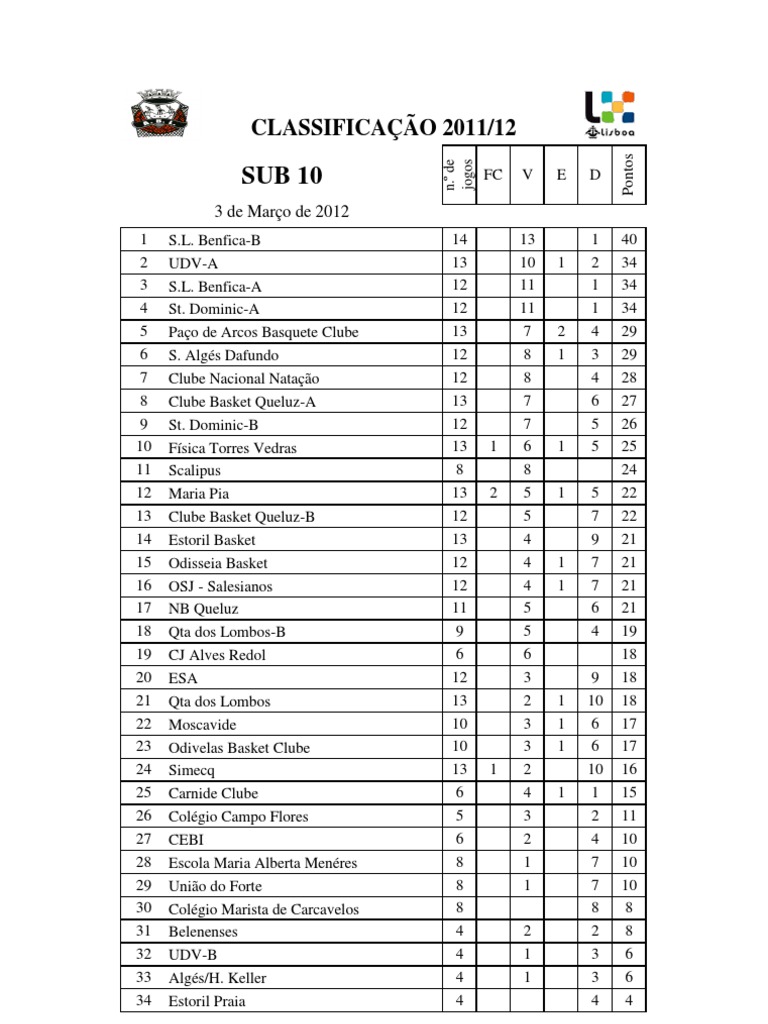 1 2 3 4 5 6 7 8 9 10 11 12 13 14 15 16 17 18 19 20 21 22 23 24 25 26 27 28 29 30 31 32 33 34 S.L. Benfica-B UDV-A S.L. Benfica-A St. Dominic-A Pao de Arcos Basquete Clube S. Algs Dafundo Clube Nacional Natao Clube Basket Queluz-A St. Dominic-B Fsica Torres Vedras Scalipus Maria Pia Clube Basket Queluz-B Estoril Basket Odisseia Basket OSJ - Salesianos NB Queluz Qta dos Lombos-B CJ Alves Redol ESA Qta dos Lombos Moscavide Odivelas Basket Clube Simecq Carnide Clube Colgio Campo Flores CEBI Escola Maria Alberta Menres Unio do Forte Colgio Marista de Carcavelos Belenenses UDV-B Algs/H. Keller Estoril Praia