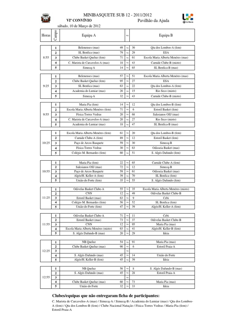 Belenenses (mas) SL Benfica (mas) Clube Basket Queluz (fem) C. Marista de Carcavelos-A (mas) Simecq-A Belenenses (mas) Clube Basket Queluz (fem) SL Benfica (mas) Academia do Lumiar (mas) Simecq-A Maria Pia (fem) Escola Maria Alberta Menres (fem) Fsica Torres Vedras C. Marista de Carcavelos-A (mas) Academia do Lumiar (mas) Escola Maria Alberta Menres (fem) Carnide Clube-A (fem) Pao de Arcos Basquete Fsica Torres Vedras Colgio M. Bernardes (fem) Maria Pia (fem) Salesianos OSJ (mas) Pao de Arcos Basquete Algs/H. Keller-A (fem) Unio do Forte (fem) Odivelas Basket Clube-A CNN Estoril Basket (mas) Colgio M. Bernardes (fem) Unio do Forte (fem) Odivelas Basket Clube-A Estoril Basket (mas) CNN Escola Maria Alberta Menres (misto) S. Algs Dafundo-B (mas) NB Queluz Clube Basket Queluz (mas) S. Algs Dafundo (mas) Algs/H. Keller-B (fem) NB Queluz S. Algs Dafundo (mas) Clube Basket Queluz (mas) Unio do Forte
