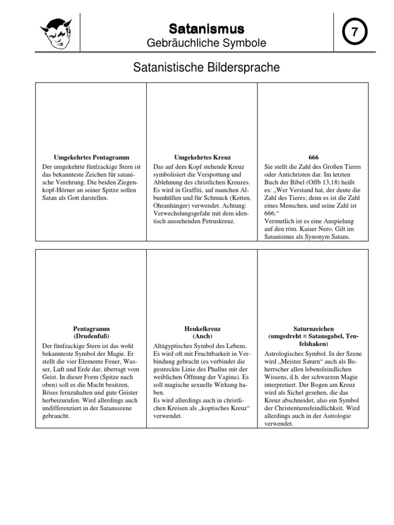 Umgekehrtes Pentagramm Der umgekehrte fnfzackige Stern ist das bekannteste Zeichen fr satanische Verehrung. Die beiden Ziegenkopf-Hrner an seiner Spitze sollen Satan als Gott darstellen. Umgekehrtes Kreuz Das auf dem Kopf stehende Kreuz symbolisiert die Verspottung und Ablehnung des christlichen Kreuzes. Es wird in Graffiti, auf manchen Albumhllen und fr Schmuck (Ketten, Ohranhnger) verwendet. Achtung: Verwechslungsgefahr mit dem identisch aussehenden Petruskreuz.