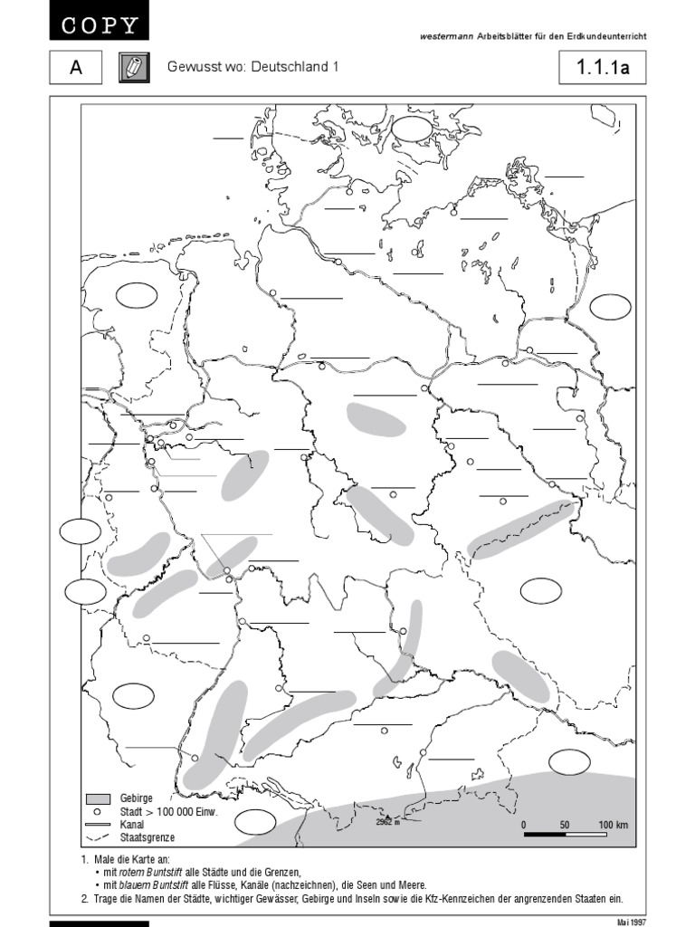 1. Male die Karte an: mit rotem Buntstift alle Stdte und die Grenzen, mit blauem Buntstift alle Flsse, Kanle (nachzeichnen), die Seen und Meere. 2. Trage die Namen der Stdte, wichtiger Gewsser, Gebirge und Inseln sowie die Kfz-Kennzeichen der angrenzenden Staaten ein.