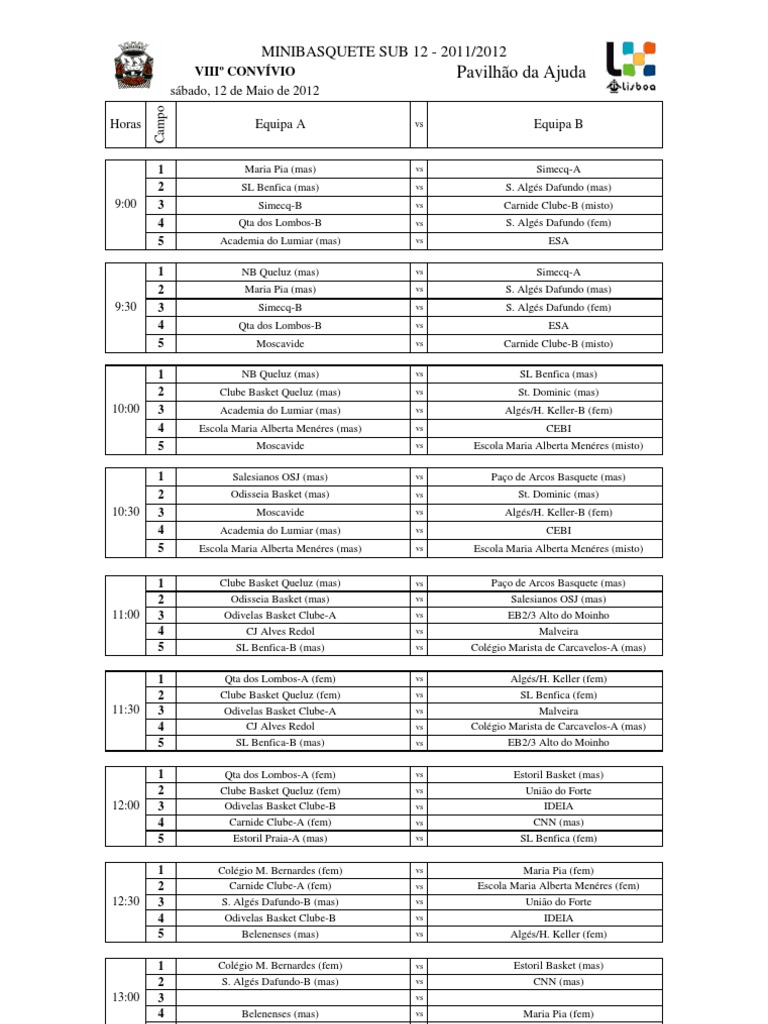 Maria Pia (mas) SL Benfica (mas) Simecq-B Qta dos Lombos-B Academia do Lumiar (mas) NB Queluz (mas) Maria Pia (mas) Simecq-B Qta dos Lombos-B Moscavide NB Queluz (mas) Clube Basket Queluz (mas) Academia do Lumiar (mas) Escola Maria Alberta Menres (mas) Moscavide Salesianos OSJ (mas) Odisseia Basket (mas) Moscavide Academia do Lumiar (mas) Escola Maria Alberta Menres (mas) Clube Basket Queluz (mas) Odisseia Basket (mas) Odivelas Basket Clube-A CJ Alves Redol SL Benfica-B (mas) Qta dos Lombos-A (fem) Clube Basket Queluz (fem) Odivelas Basket Clube-A CJ Alves Redol SL Benfica-B (mas) Qta dos Lombos-A (fem) Clube Basket Queluz (fem) Odivelas Basket Clube-B Carnide Clube-A (fem) Estoril Praia-A (mas) Colgio M. Bernardes (fem) Carnide Clube-A (fem) S. Algs Dafundo-B (mas) Odivelas Basket Clube-B Belenenses (mas) Colgio M. Bernardes (fem) S. Algs Dafundo-B (mas) Belenenses (mas) Estoril Praia-A (mas)