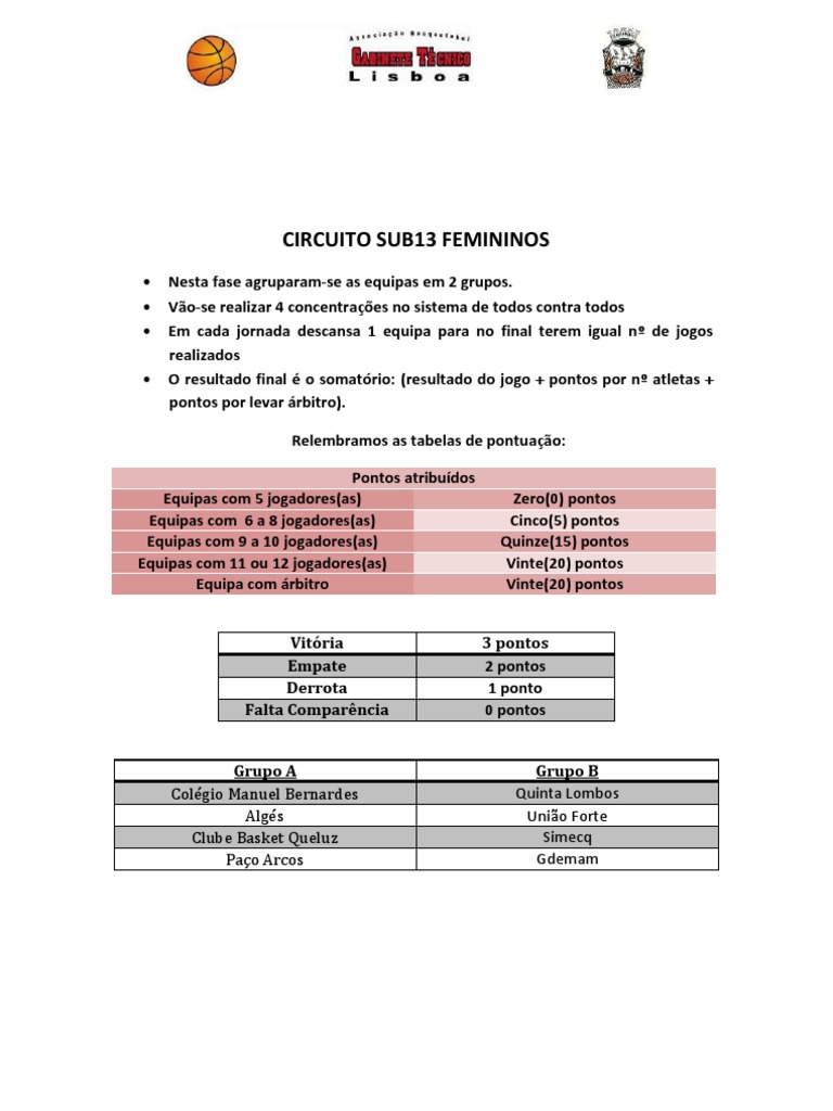 Nesta fase agruparam-se as equipas em 2 grupos. Vo-se realizar 4 concentraes no sistema de todos contra todos Em cada jornada descansa 1 equipa para no final terem igual n de jogos realizados O resultado final o somatrio: (resultado do jogo + pontos por n atletas + pontos por levar rbitro). Relembramos as tabelas de pontuao: Pontos atribudos Equipas com 5 jogadores(as) Equipas com 6 a 8 jogadores(as) Equipas com 9 a 10 jogadores(as) Equipas com 11 ou 12 jogadores(as) Equipa com rbitro Vitria Empate Derrota Falta Comparncia Grupo A Colgio Manuel Bernardes Algs Clube Basket Queluz Pao Arcos Zero(0) pontos Cinco(5) pontos Quinze(15) pontos Vinte(20) pontos Vinte(20) pontos 3 pontos 2 pontos 1 ponto 0 pontos Grupo B Quinta Lombos Unio Forte Simecq Gdemam